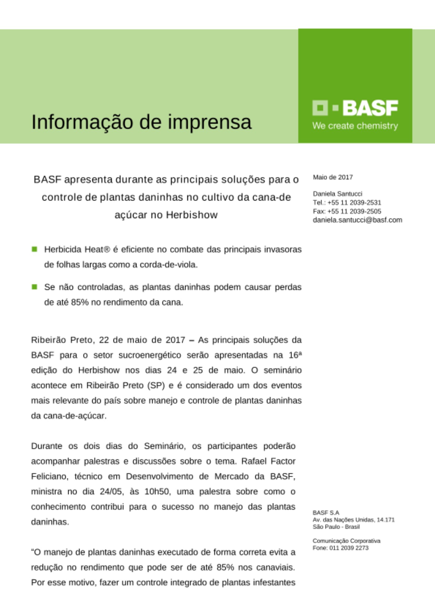 BASF apresenta durante as principais soluções para o controle de plantas daninhas no cultivo da cana-de açúcar no Herbishow