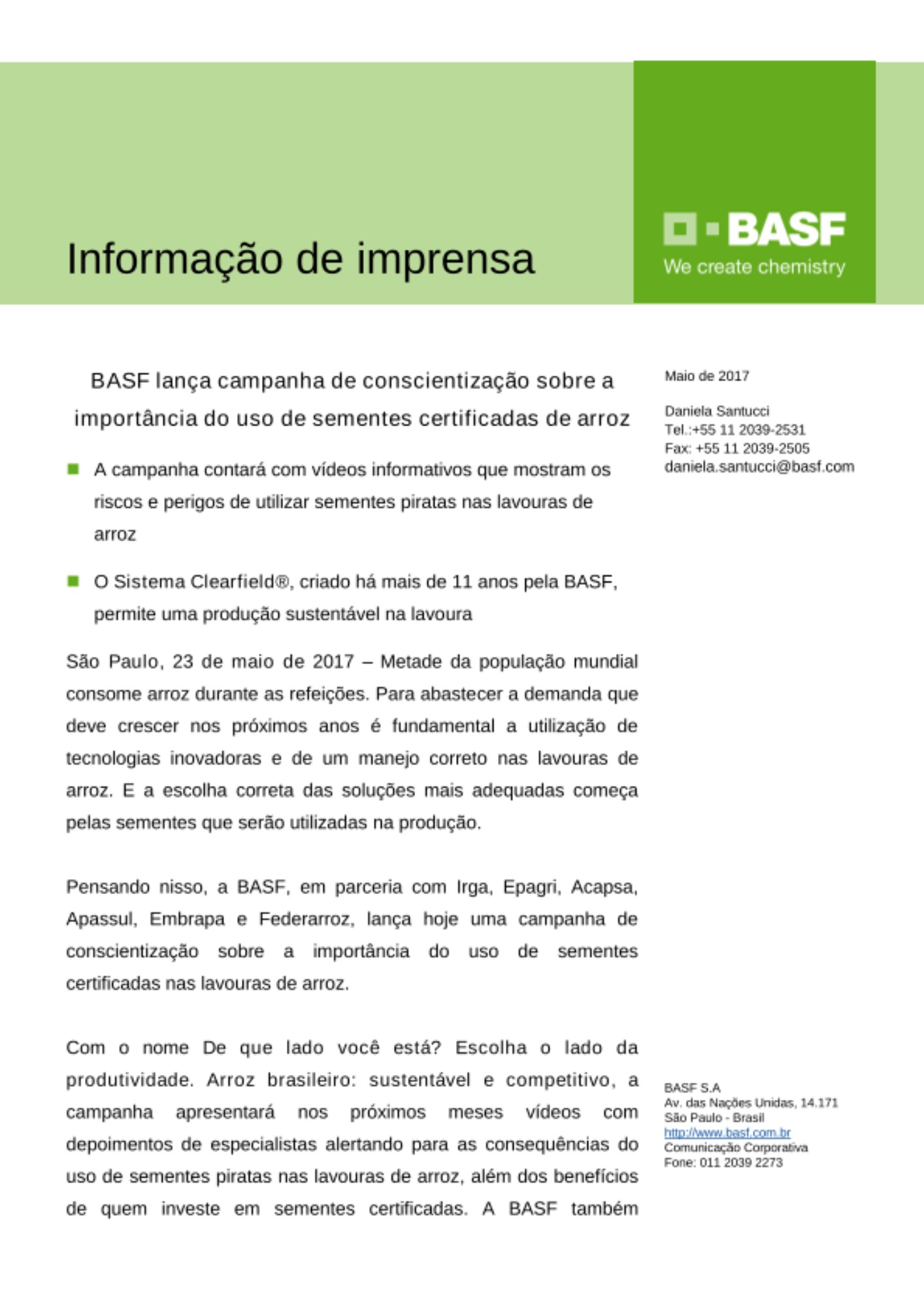 Com o nome De que lado você está? Escolha o lado da produtividade. Arroz brasileiro: sustentável e competitivo, a campanha apresentará nos próximos meses vídeos com depoimentos de especialistas alertando para as consequências do uso de sementes piratas nas lavouras de arroz, além dos benefícios de quem investe em sementes certificadas. A BASF também disponibilizará uma linha direta para esclarecimentos de dúvidas por meio do Serviço de Atendimento ao Cliente no 0800 0192 500.