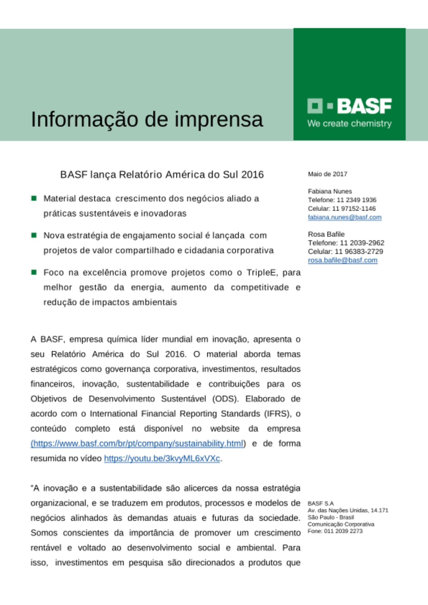 A BASF, empresa química líder mundial em inovação, apresenta o seu Relatório América do Sul 2016. O material aborda temas estratégicos como governança corporativa, investimentos, resultados financeiros, inovação, sustentabilidade e contribuições para os Objetivos de Desenvolvimento Sustentável (ODS). Elaborado de acordo com o International Financial Reporting Standards (IFRS), o conteúdo completo está disponível no website da empresa (https://www.basf.com/br/pt/company/sustainability.html) e de forma resumida no vídeo https://youtu.be/3kvyML6xVXc.