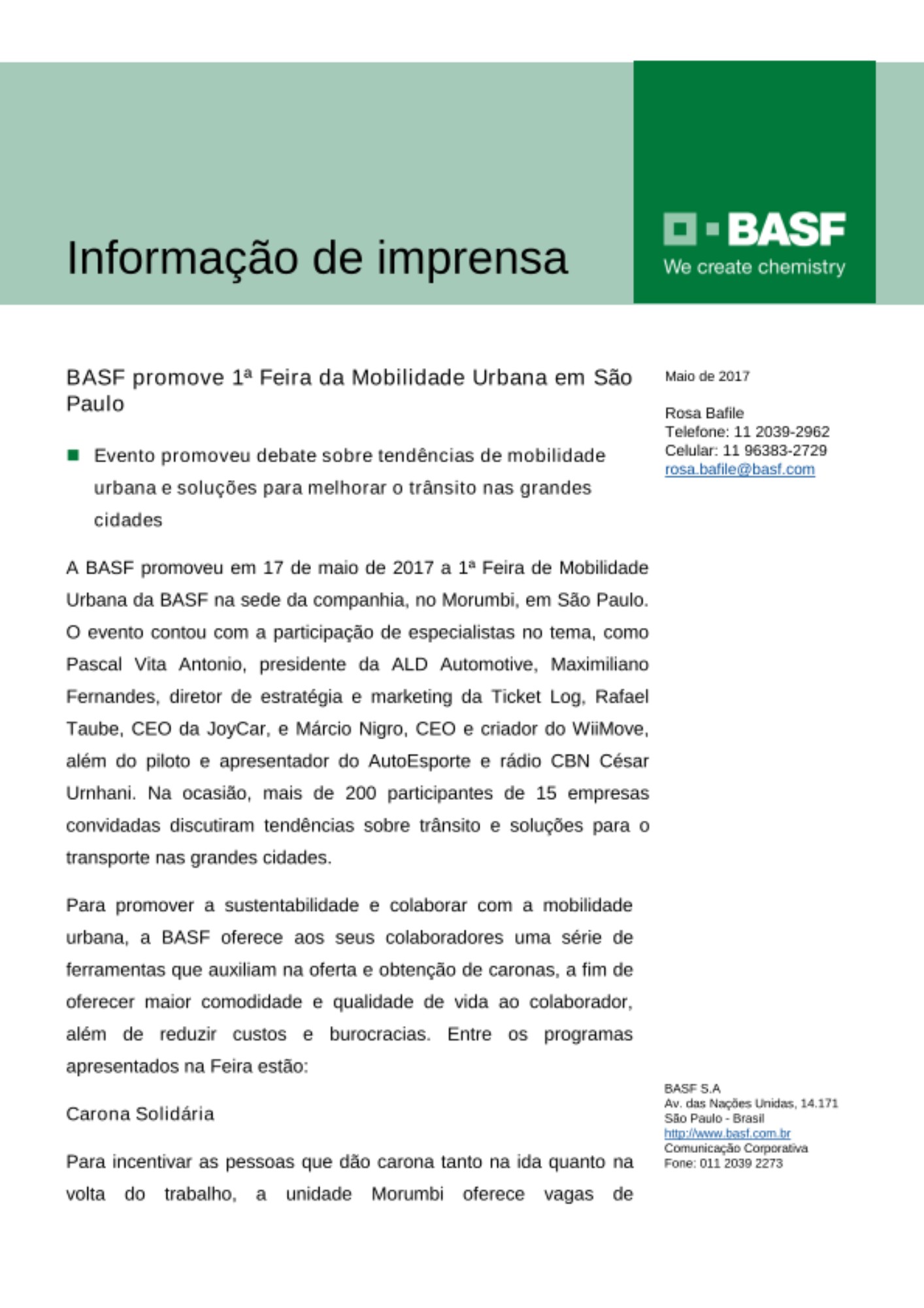 A BASF promoveu em 17 de maio de 2017 a 1ª Feira de Mobilidade Urbana da BASF na sede da companhia, no Morumbi, em São Paulo. O evento contou com a participação de especialistas no tema, como Pascal Vita Antonio, presidente da ALD Automotive, Maximiliano Fernandes, diretor de estratégia e marketing da Ticket Log, Rafael Taube, CEO da JoyCar, e Márcio Nigro, CEO e criador do WiiMove, além do piloto e apresentador do AutoEsporte e rádio CBN César Urnhani. Na ocasião, mais de 200 participantes de 15 empresas convidadas discutiram tendências sobre trânsito e soluções para o transporte nas grandes cidades.