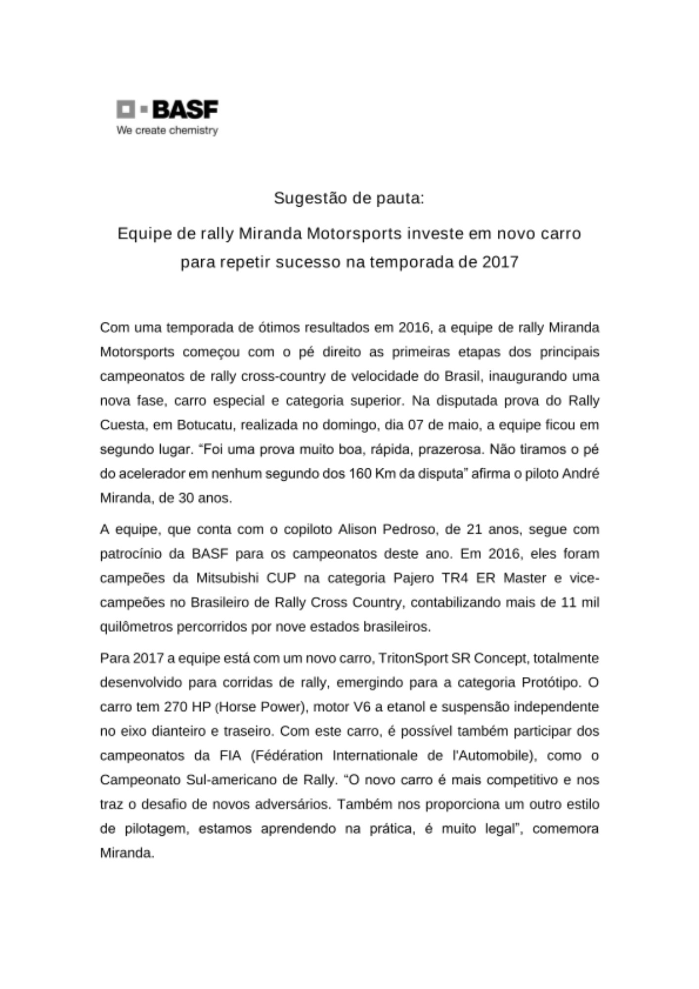 O piloto é engenheiro de produto da BASF para o Cellasto, um elastômero de poliuretano microcelular, usado no amortecimento de veículos para redução dos níveis de ruídos, vibração e de aspereza (NVH). Os componentes do Cellasto, batentes de suspensão, Top Mountings e isoladores de mola, são aplicados na indústria de automóveis como solução de absorção de energia. “Esse patrocínio representa, não só o apoio da BASF ao talento de um colaborador, mas também a importante atuação da companhia na cadeia de produção automobilística, oferecendo soluções e tecnologias de ponta para a produção de veículos mais confortáveis, com melhor design, desempenho e eficiência energética, considera Murilo Feltran, gerente de marketing de Materiais de Performance da BASF.