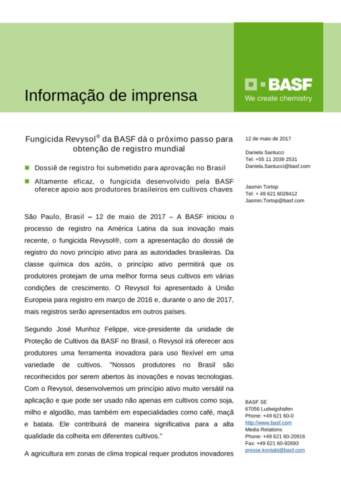 A BASF iniciou o processo de registro na América Latina da sua inovação mais recente, o fungicida Revysol®, com a apresentação do dossiê de registro do novo princípio ativo para as autoridades brasileiras. Da classe química dos azóis, o princípio ativo permitirá que os produtores protejam de uma melhor forma seus cultivos em várias condições de crescimento. O Revysol foi apresentado à União Europeia para registro em março de 2016 e, durante o ano de 2017, mais registros serão apresentados em outros países.