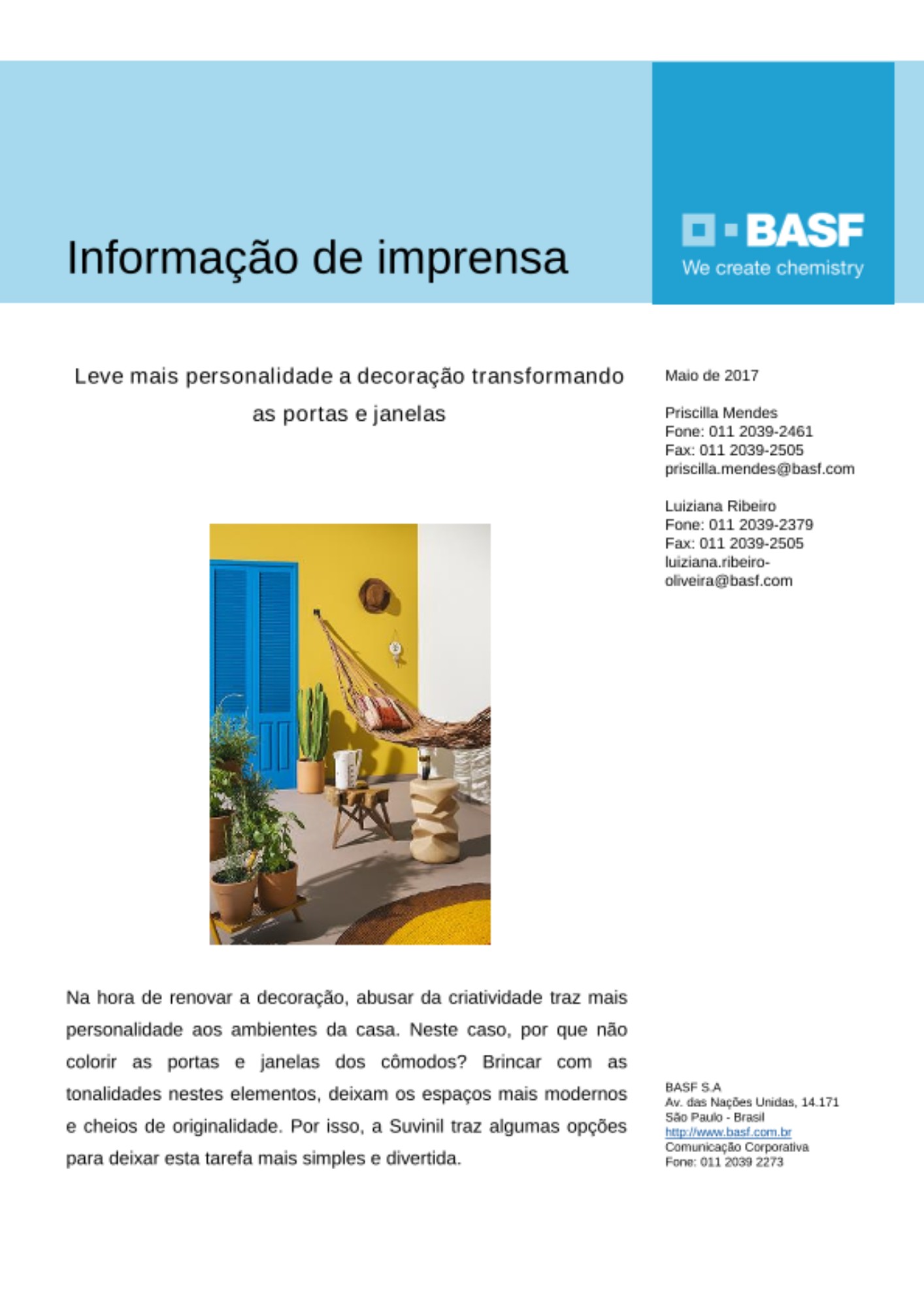 A Suvinil é a marca de tintas imobiliárias premium da BASF e lidera a participação no segmento. A marca tem uma estratégia de negócio consistente, pautada em relacionamento com clientes, inovação e fortes investimentos. Adquirida em 1969 pela BASF, que entrava no ramo de tintas globalmente, a Suvinil possui mais de 50 anos de boas práticas, que resultaram numa completa linha de produtos constituída por látex PVA, acrílicos, esmaltes, vernizes, epóxi e complementos para pintura. Seu portfólio, produzido nas fábricas instaladas em São Bernardo do Campo (SP) e Jaboatão dos Guararapes (PE), atende todo o mercado nacional.