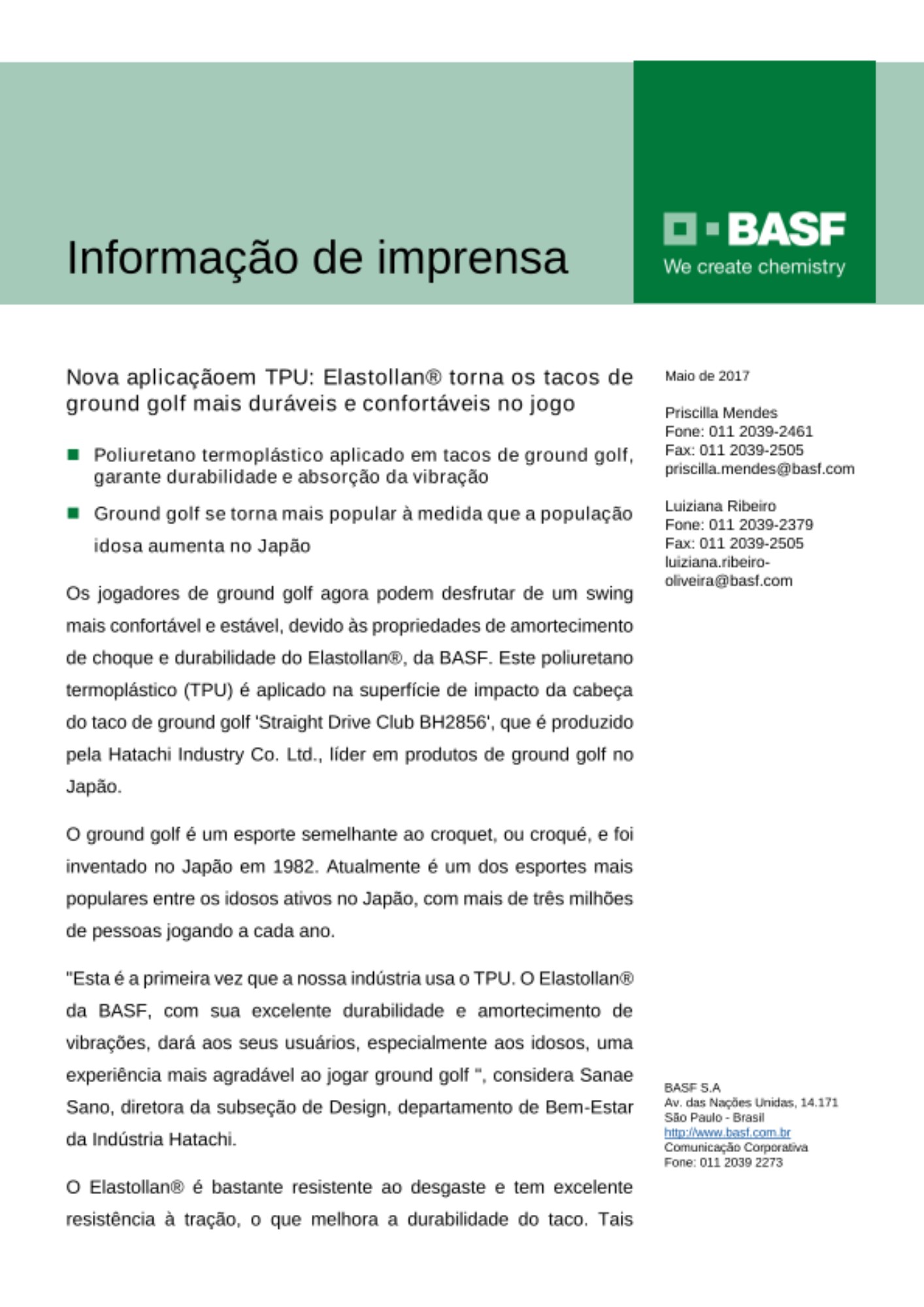 "Esta é a primeira vez que a nossa indústria usa o TPU. O Elastollan® da BASF, com sua excelente durabilidade e amortecimento de vibrações, dará aos seus usuários, especialmente aos idosos, uma experiência mais agradável ao jogar ground golf ", considera Sanae Sano, diretora da subseção de Design, departamento de Bem-Estar da Indústria Hatachi.