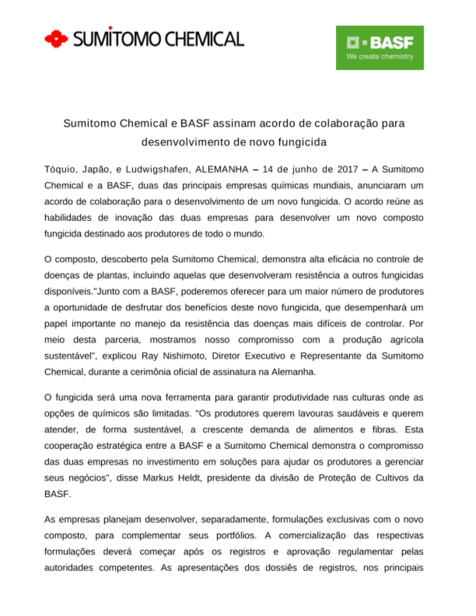 A Sumitomo Chemical e a BASF, duas das principais empresas químicas mundiais, anunciaram um acordo de colaboração para o desenvolvimento de um novo fungicida. O acordo reúne as habilidades de inovação das duas empresas para desenvolver um novo composto fungicida destinado aos produtores de todo o mundo.