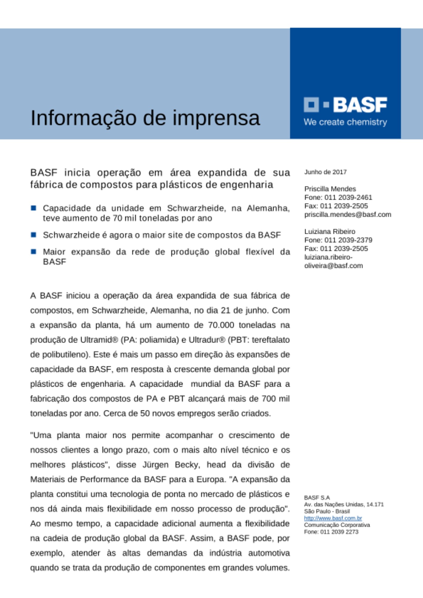 A BASF iniciou a operação da área expandida de sua fábrica de compostos, em Schwarzheide, Alemanha, no dia 21 de junho. Com a expansão da planta, há um aumento de 70.000 toneladas na produção de Ultramid® (PA: poliamida) e Ultradur® (PBT: tereftalato de polibutileno). Este é mais um passo em direção às expansões de capacidade da BASF, em resposta à crescente demanda global por plásticos de engenharia. A capacidade mundial da BASF para a fabricação dos compostos de PA e PBT alcançará mais de 700 mil toneladas por ano. Cerca de 50 novos empregos serão criados.