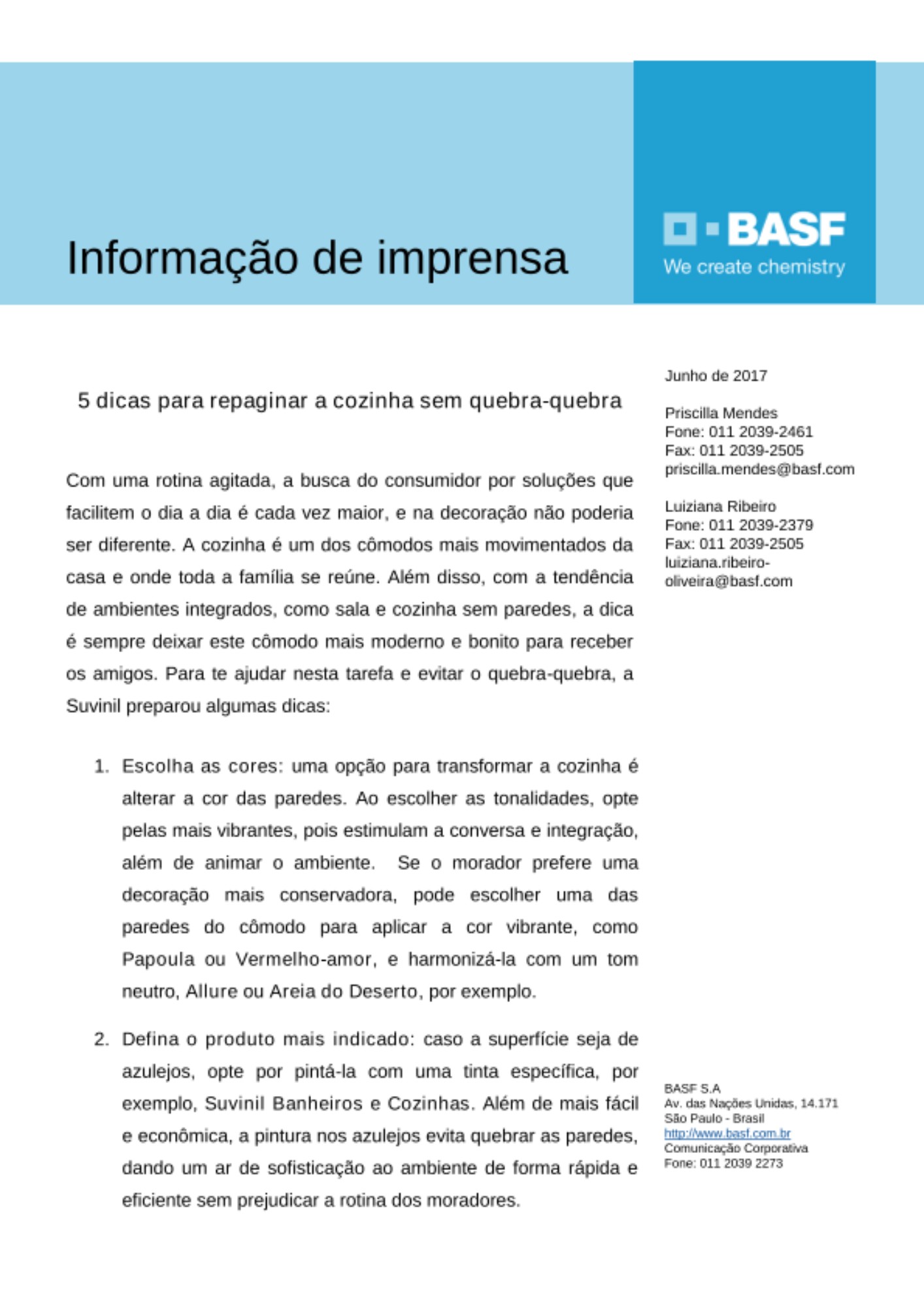 Na BASF, nós transformamos a química para um futuro sustentável. Nós combinamos o sucesso econômico com a proteção ambiental e responsabilidade social. O Grupo BASF conta com aproximadamente 114 mil colaboradores que trabalham para contribuir com o sucesso de nossos clientes em quase todos os setores e países do mundo. Nosso portfólio é organizado em 5 segmentos: Químicos, Produtos de Performance, Materiais e Soluções Funcionais, Soluções para Agricultura e Petróleo e Gás. A BASF gerou vendas de mais de € 58 bilhões em 2016. As ações da BASF são comercializadas no mercado de ações de Frankfurt (BAS), Londres (BFA) e Zurich (AN). Para mais informações, acesse: www.basf.com.br