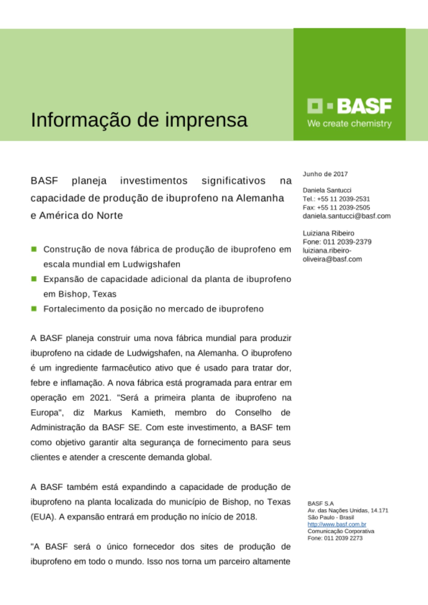 A BASF também está expandindo a capacidade de produção de ibuprofeno na planta localizada do município de Bishop, no Texas (EUA). A expansão entrará em produção no início de 2018.