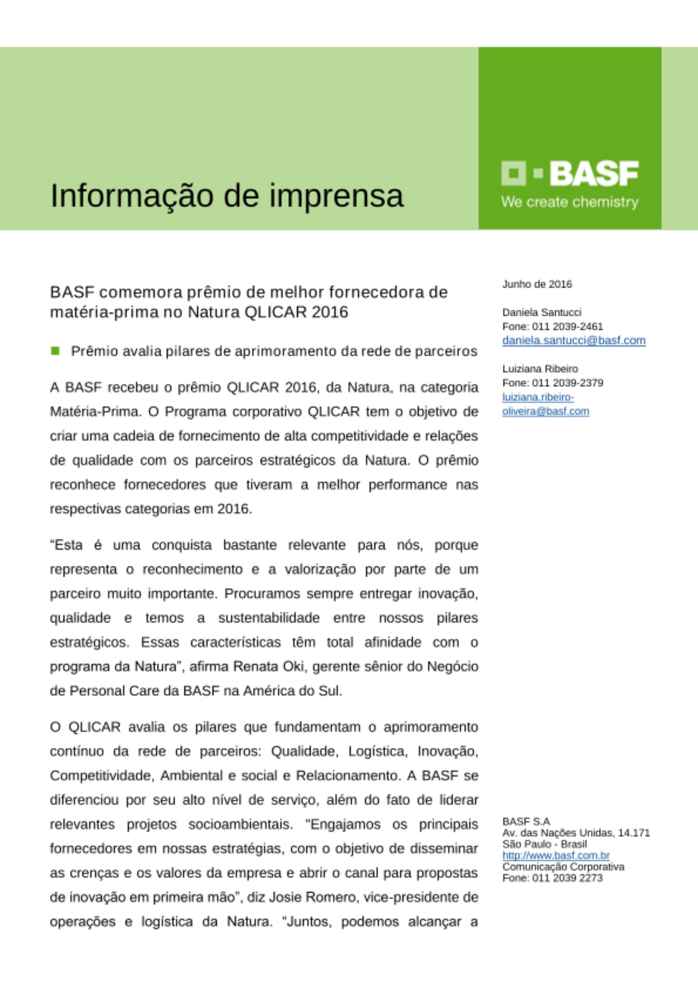 A BASF recebeu o prêmio QLICAR 2016, da Natura, na categoria Matéria-Prima. O Programa corporativo QLICAR tem o objetivo de criar uma cadeia de fornecimento de alta competitividade e relações de qualidade com os parceiros estratégicos da Natura. O prêmio reconhece fornecedores que tiveram a melhor performance nas respectivas categorias em 2016.