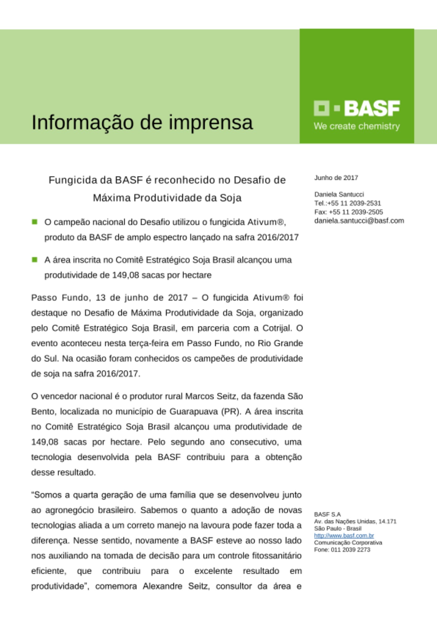 A BASF participa do evento desde sua primeira edição, que aconteceu na safra 2008/2009. O Desafio de Máxima Produtividade da Soja da safra 2016/2017 recebeu mais de 5 mil inscrições de agricultores de diferentes estados. Além dos irmãos Marcos e Alexandre Seitz, mais dois vencedores do prêmio organizado pelo Comitê Estratégico Soja Brasil (CESB) utilizaram o fungicida Orkestra®SC e demais produtos da linha BASF: Elton Zanella, do município de Campos de Júlio (MT), que obteve uma produtividade de 122,20 sacas por hectare, e o produtor de soja Leandro Ficagna, que colheu 95,76 sacas por hectare no município de Luís Eduardo Magalhães (BA).