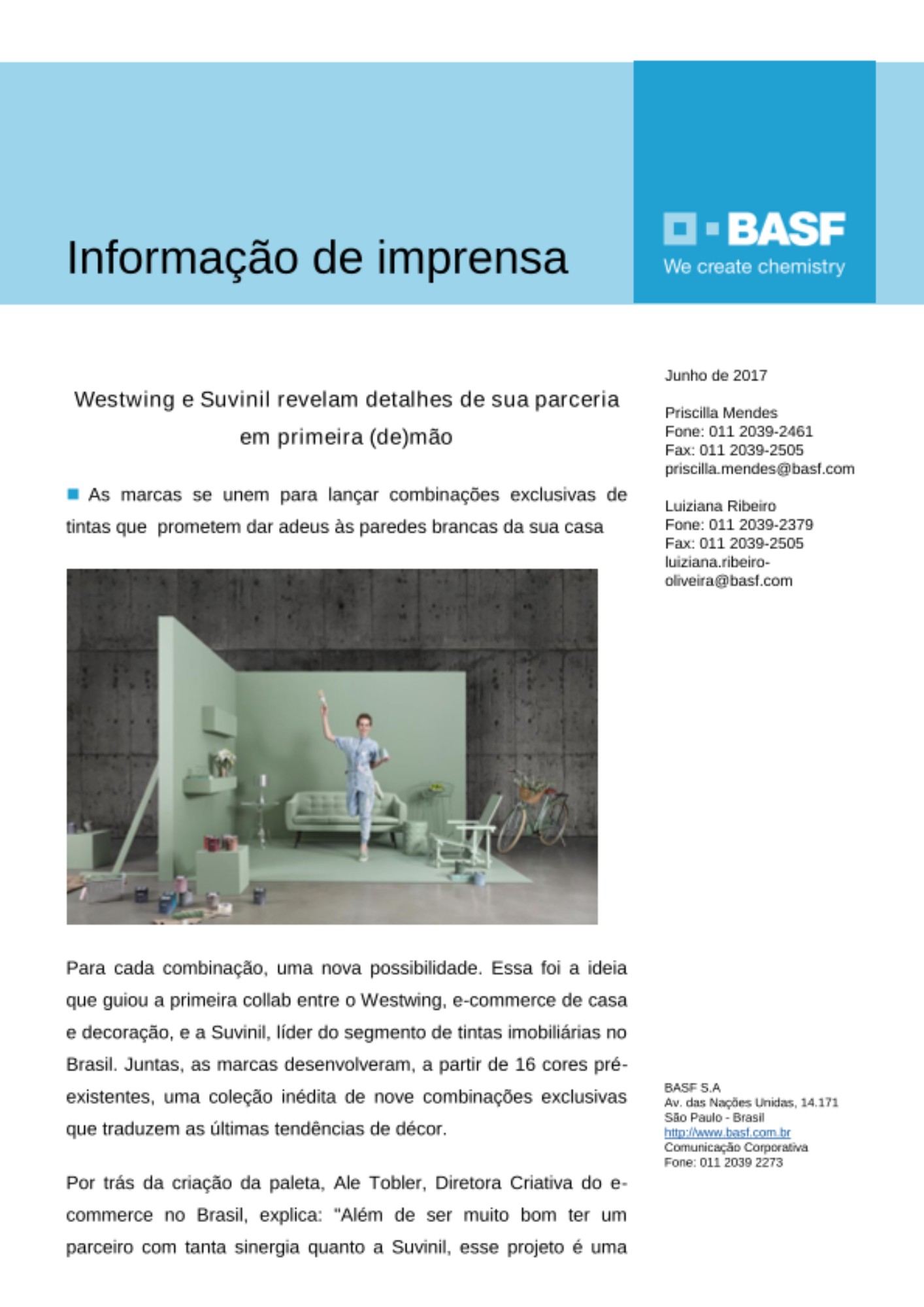 “Estamos muito felizes de firmar esta parceria com o Westwing, uma marca que reforça nossa estratégia de sempre entregar soluções criativas e inovadoras para o consumidor que enxerga na sua casa seu maior orgulho. Para a Suvinil, é fundamental fazer parte deste projeto e enfatizar nossa expertise em tendências de mercado e cores”, afirma Carla Camargo, diretora de marketing da Suvinil.