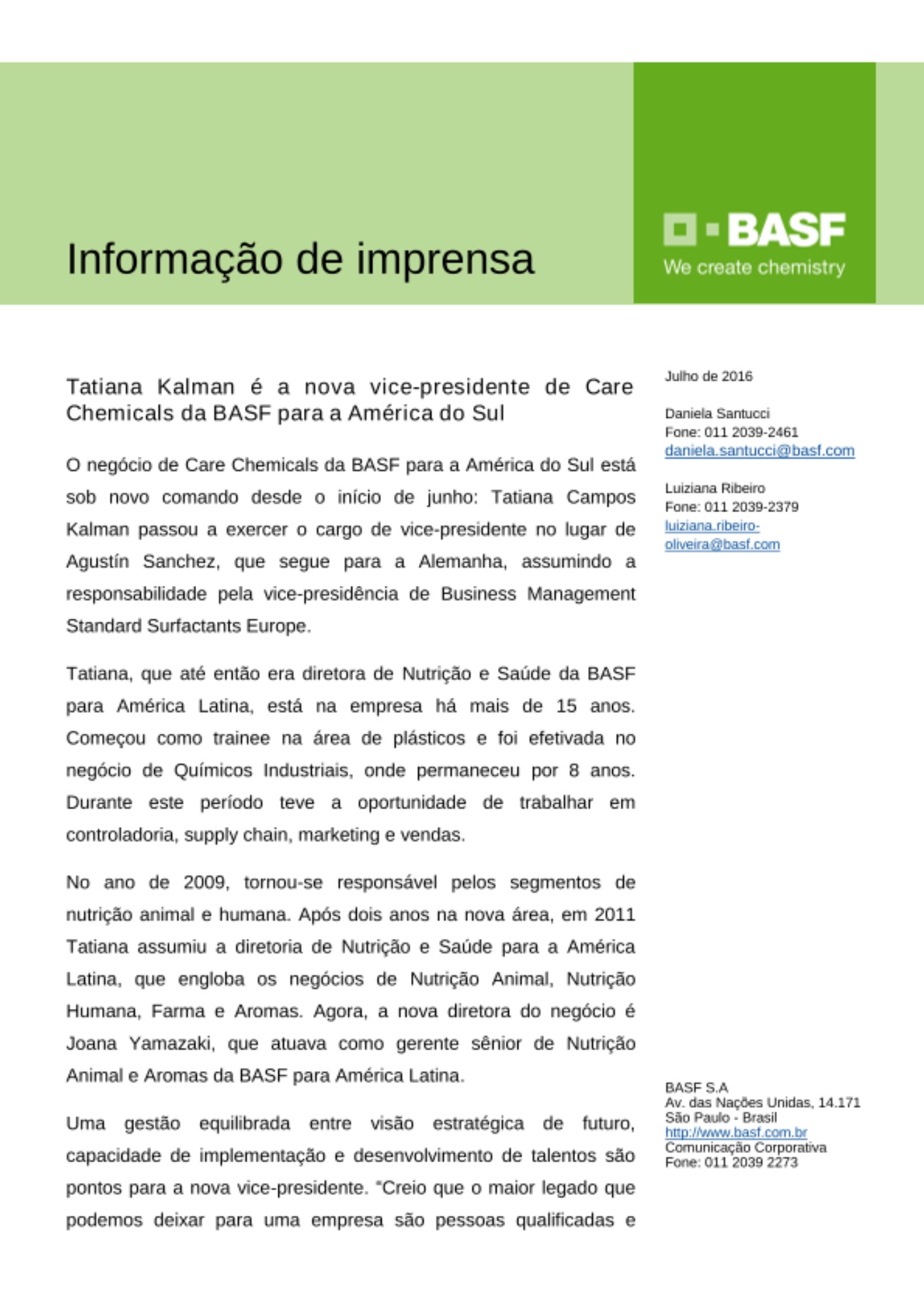 O negócio de Care Chemicals da BASF para a América do Sul está sob novo comando desde o início de junho: Tatiana Campos Kalman passou a exercer o cargo de vice-presidente no lugar de Agustín Sanchez, que segue para a Alemanha, assumindo a responsabilidade pela vice-presidência de Business Management Standard Surfactants Europe.