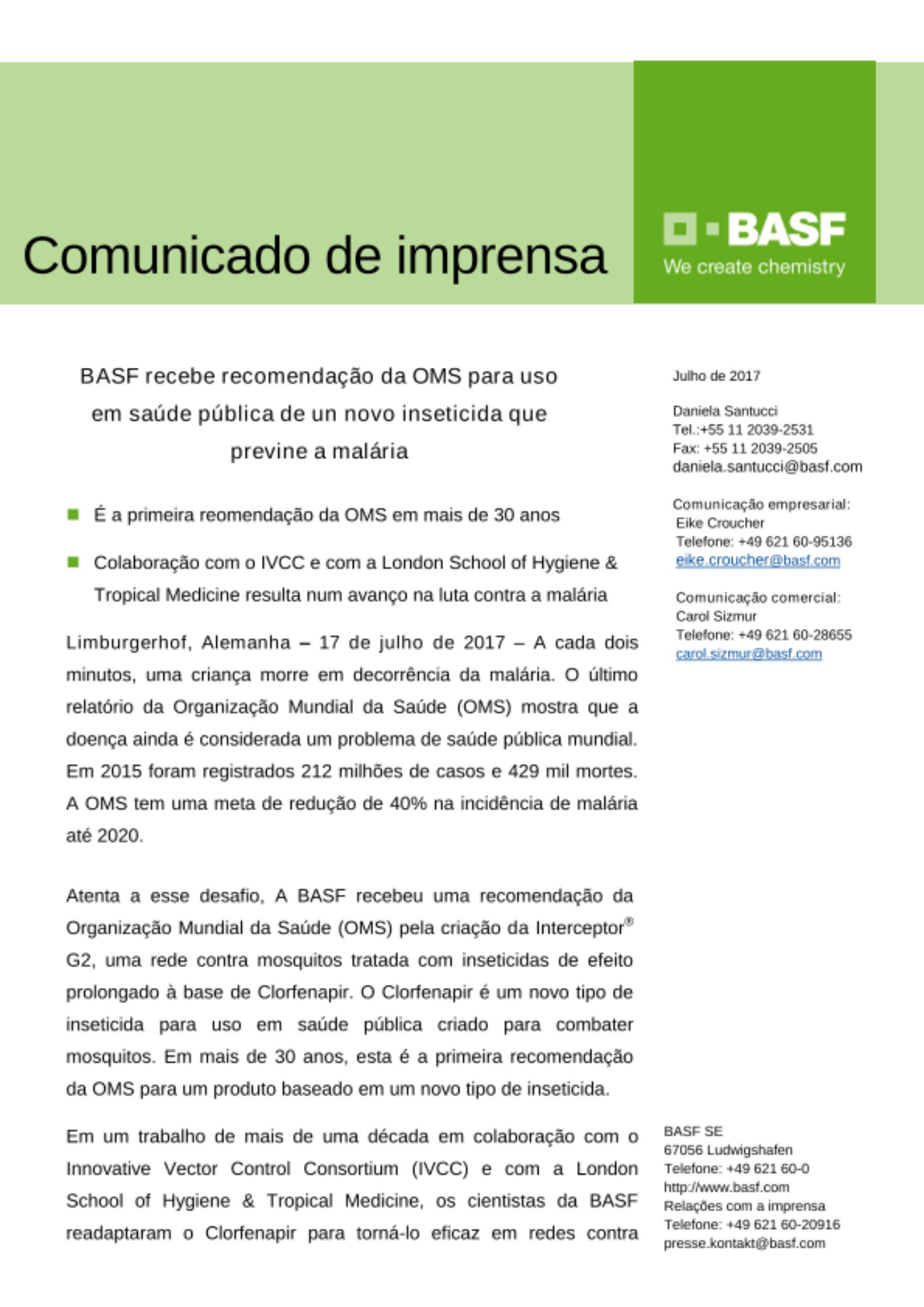Atenta a esse desafio, a BASF recebeu uma recomendação da Organização Mundial da Saúde (OMS) pela criação da Interceptor® G2, uma rede contra mosquitos tratada com inseticidas de efeito prolongado à base de Clorfenapir. O Clorfenapir é um novo tipo de inseticida para uso em saúde pública criado para combater mosquitos. Em mais de 30 anos, esta é a primeira recomendação da OMS para um produto baseado em um novo tipo de inseticida.