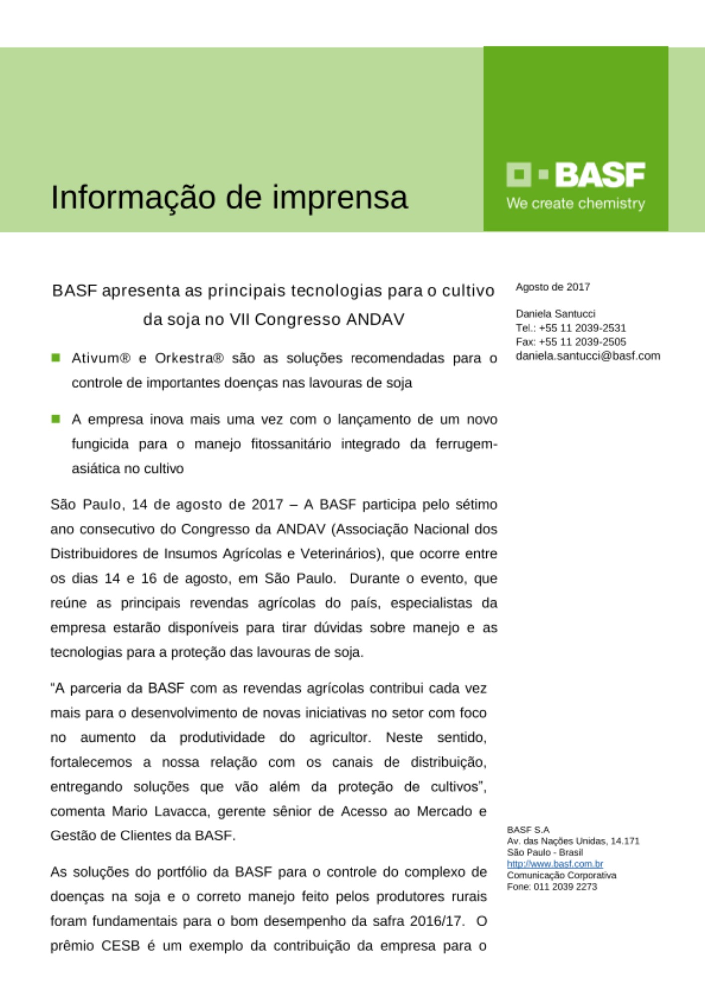 A BASF participa pelo sétimo ano consecutivo do Congresso da ANDAV (Associação Nacional dos Distribuidores de Insumos Agrícolas e Veterinários), que ocorre entre os dias 14 e 16 de agosto, em São Paulo. Durante o evento, que reúne as principais revendas agrícolas do país, especialistas da empresa estarão disponíveis para tirar dúvidas sobre manejo e as tecnologias para a proteção das lavouras de soja.