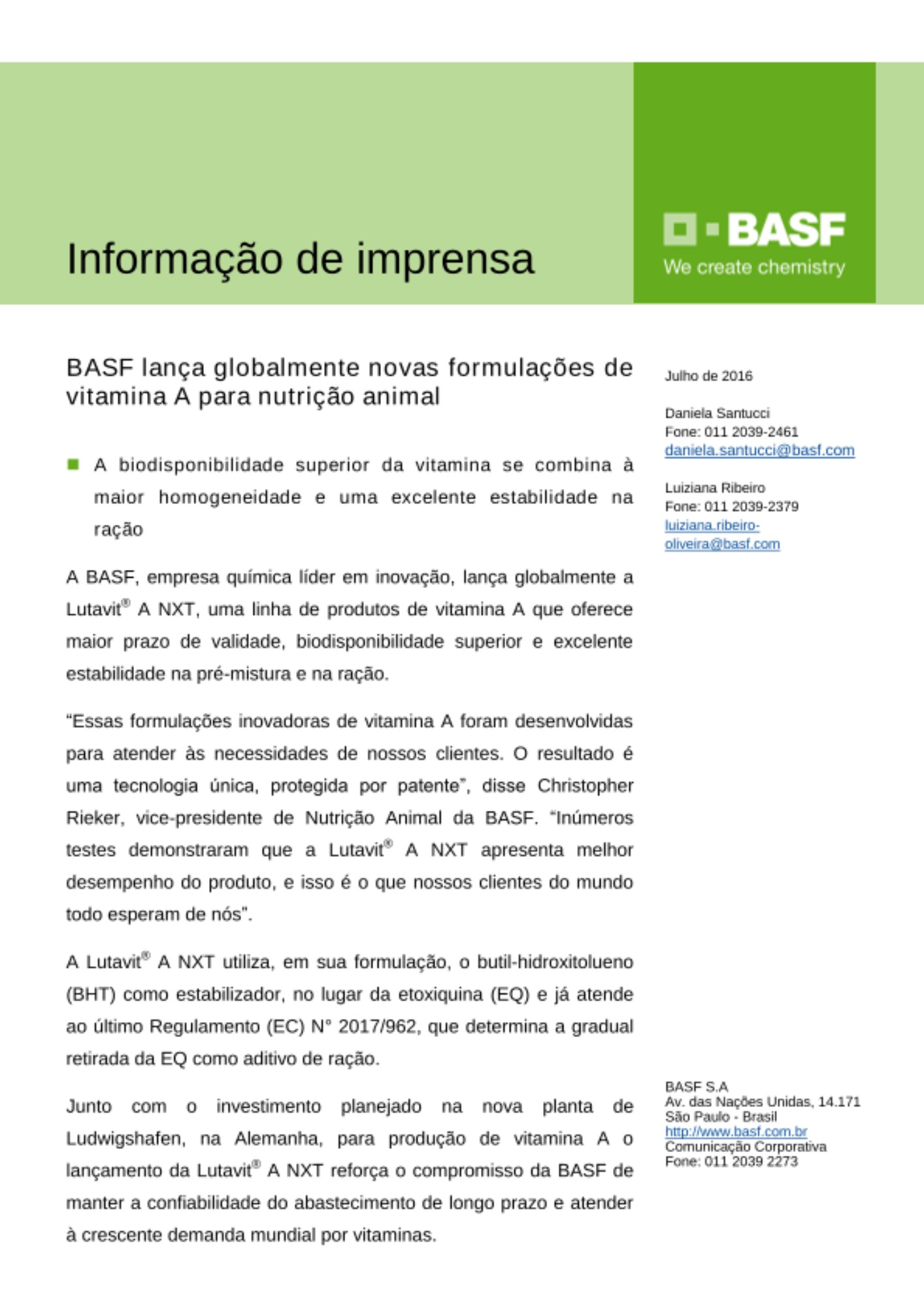 Junto com o investimento planejado na nova planta de Ludwigshafen, na Alemanha, para produção de vitamina A o lançamento da Lutavit® A NXT reforça o compromisso da BASF de manter a confiabilidade do abastecimento de longo prazo e atender à crescente demanda mundial por vitaminas.