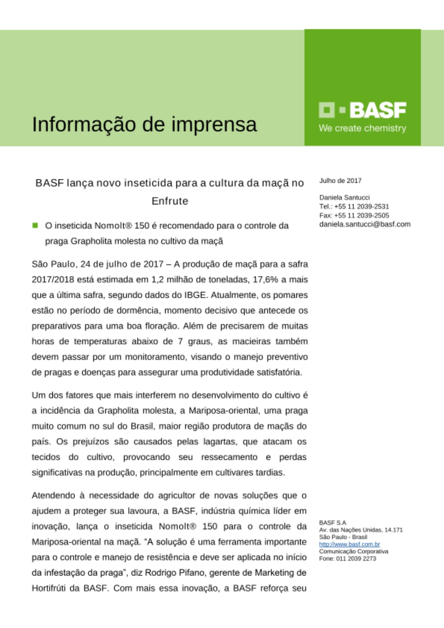 Atendendo à necessidade do agricultor de novas soluções que o ajudem a proteger sua lavoura, a BASF, indústria química líder em inovação, lança o inseticida Nomolt® 150 para o controle da Mariposa-oriental na maçã. “A solução é uma ferramenta importante para o controle e manejo de resistência e deve ser aplicada no início da infestação da praga”, diz Rodrigo Pifano, gerente de Marketing de Hortifrúti da BASF. Com mais essa inovação, a BASF reforça seu compromisso de desenvolver constantemente soluções inovadoras que tragam maior rentabilidade ao produtor rural.