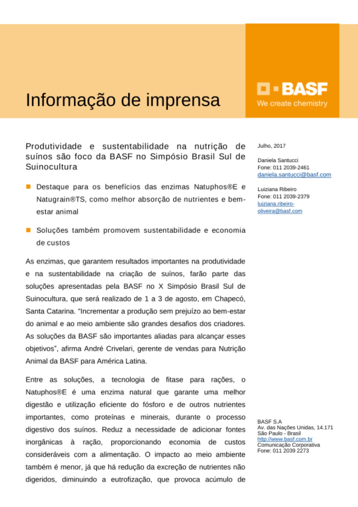 As enzimas, que garantem resultados importantes na produtividade e na sustentabilidade na criação de suínos, farão parte das soluções apresentadas pela BASF no X Simpósio Brasil Sul de Suinocultura, que será realizado de 1 a 3 de agosto, em Chapecó, Santa Catarina. “Incrementar a produção sem prejuízo ao bem-estar do animal e ao meio ambiente são grandes desafios dos criadores. As soluções da BASF são importantes aliadas para alcançar esses objetivos”, afirma André Crivelari, gerente de vendas para Nutrição Animal da BASF para América Latina.