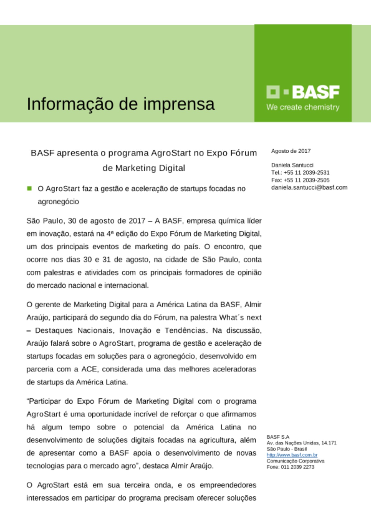 “Participar do Expo Fórum de Marketing Digital com o programa AgroStart é uma oportunidade incrível de reforçar o que afirmamos há algum tempo sobre o potencial da América Latina no desenvolvimento de soluções digitais focadas na agricultura, além de apresentar como a BASF apoia o desenvolvimento de novas tecnologias para o mercado agro”, destaca Almir Araújo.