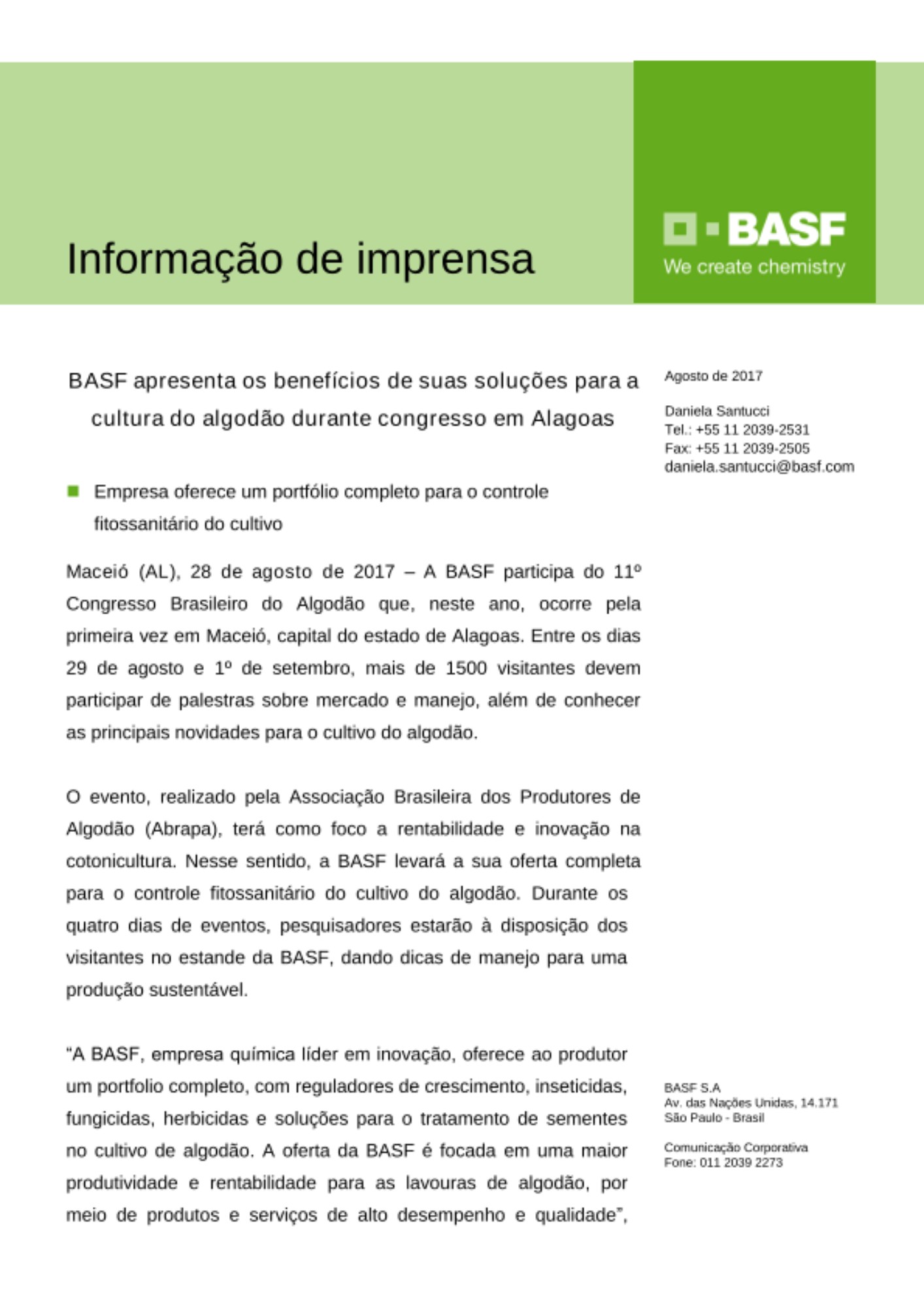 “A BASF, empresa química líder em inovação, oferece ao produtor um portfolio completo, com reguladores de crescimento, inseticidas, fungicidas, herbicidas e soluções para o tratamento de sementes no cultivo de algodão. A oferta da BASF é focada em uma maior produtividade e rentabilidade para as lavouras de algodão, por meio de produtos e serviços de alto desempenho e qualidade”, destaca Luiz Fernando Straioto, gerente de Cultivo Algodão da BASF.