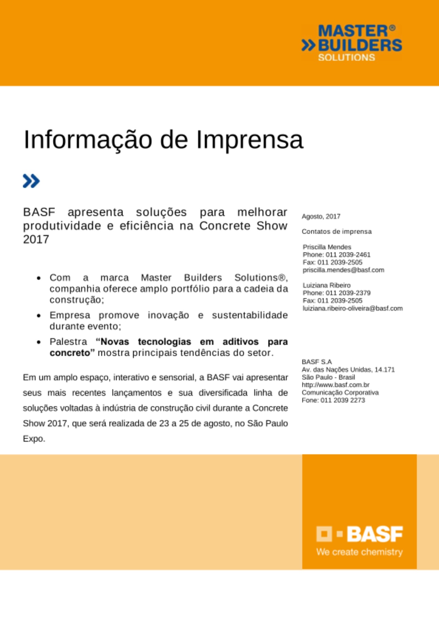 Em um amplo espaço, interativo e sensorial, a BASF vai apresentar seus mais recentes lançamentos e sua diversificada linha de soluções voltadas à indústria de construção civil durante a Concrete Show 2017, que será realizada de 23 a 25 de agosto, no São Paulo Expo. “Procuramos oferecer ao mercado soluções inovadoras que garantam aumento na produtividade, eficiência, redução de custos e, principalmente, promovam sustentabilidade”, afirma Ariane Linhares Delegá Zanetti, gerente de marketing de Químicos para Construção. No espaço de palestras, realizadas paralelamente, o engenheiro Marcelo Henriques, gerente de vendas sênior de Químicos para Construção da BASF, falará sobre as “Novas tecnologias em aditivos para concreto”, no dia 25 de agosto, às 15h.