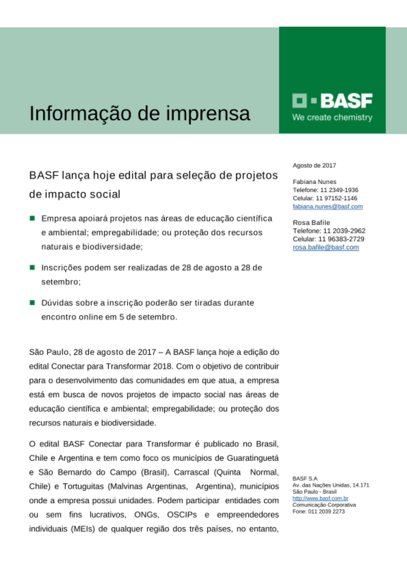 A BASF lança hoje a edição do edital Conectar para Transformar 2018. Com o objetivo de contribuir para o desenvolvimento das comunidades em que atua, a empresa está em busca de novos projetos de impacto social nas áreas de educação científica e ambiental; empregabilidade; ou proteção dos recursos naturais e biodiversidade.