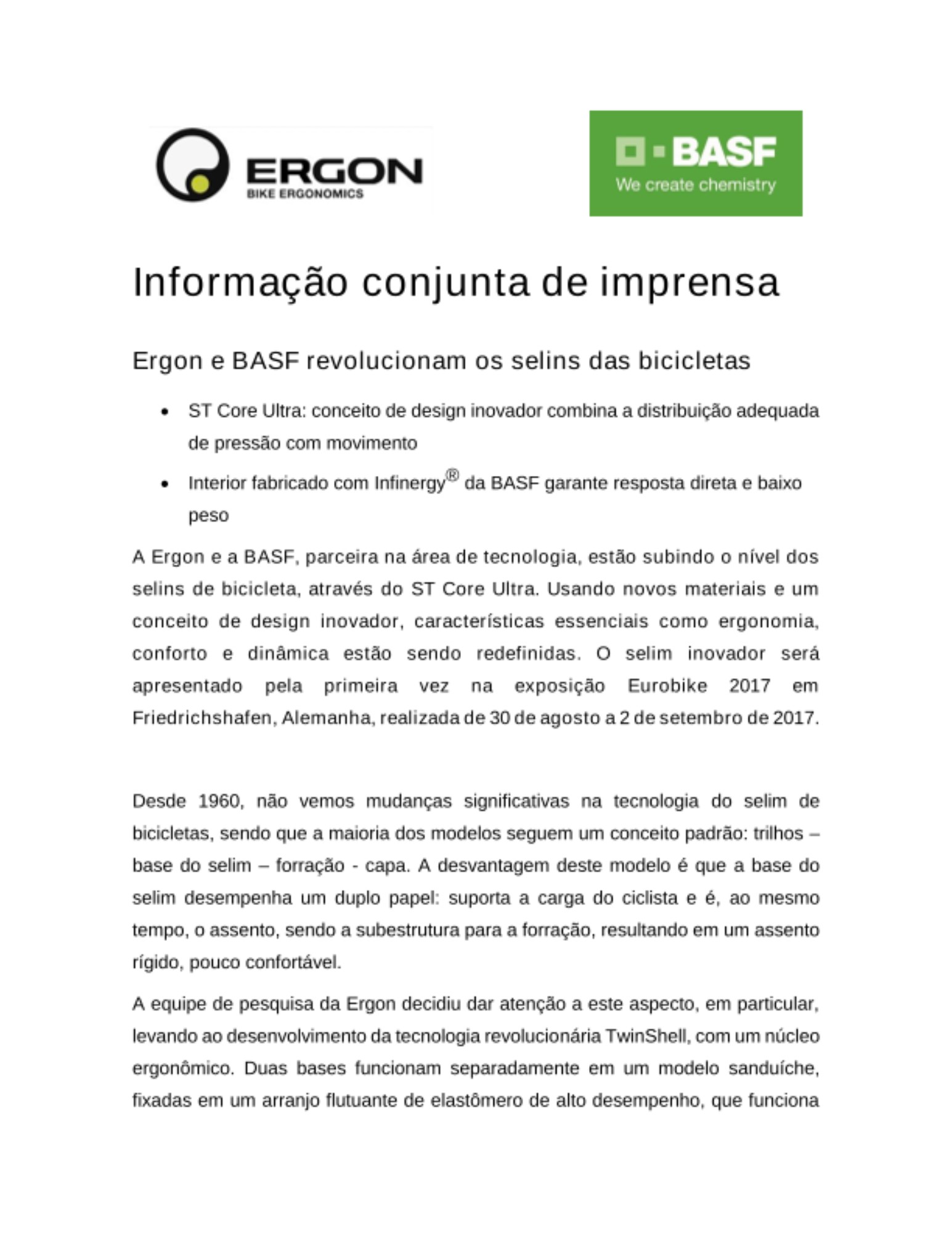 A Ergon e a BASF, parceira na área de tecnologia, estão subindo o nível dos selins de bicicleta, através do ST Core Ultra. Usando novos materiais e um conceito de design inovador, características essenciais como ergonomia, conforto e dinâmica estão sendo redefinidas. O selim inovador será apresentado pela primeira vez na exposição Eurobike 2017 em Friedrichshafen, Alemanha, realizada de 30 de agosto a 2 de setembro de 2017.