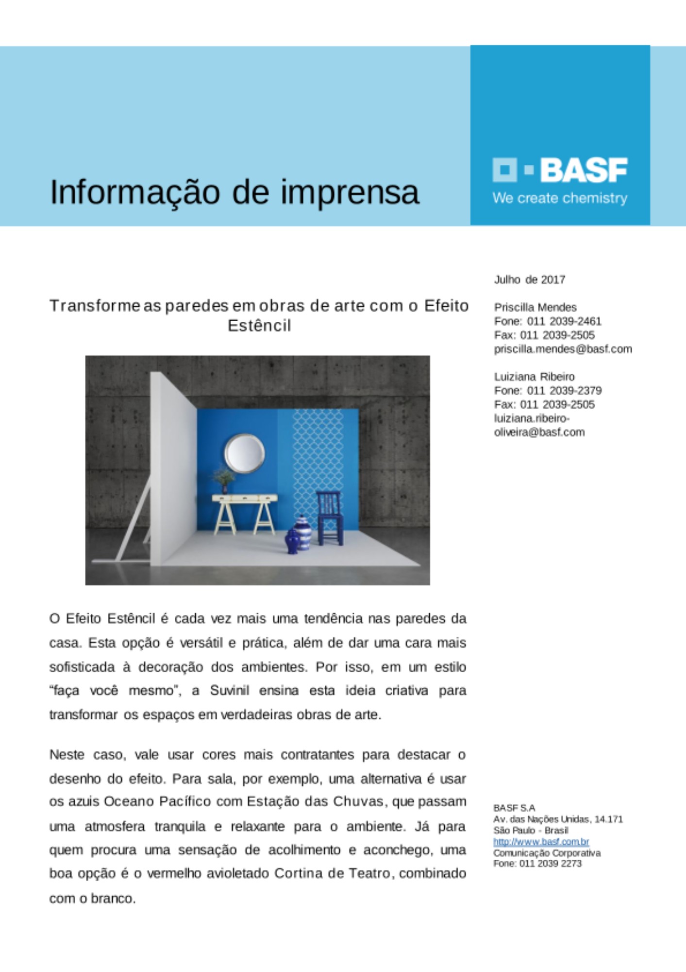 Neste caso, vale usar cores mais contratantes para destacar o desenho do efeito. Para sala, por exemplo, uma alternativa é usar os azuis Oceano Pacífico com Estação das Chuvas, que passam uma atmosfera tranquila e relaxante para o ambiente. Já para quem procura uma sensação de acolhimento e aconchego, uma boa opção é o vermelho avioletado Cortina de Teatro, combinado com o branco.
