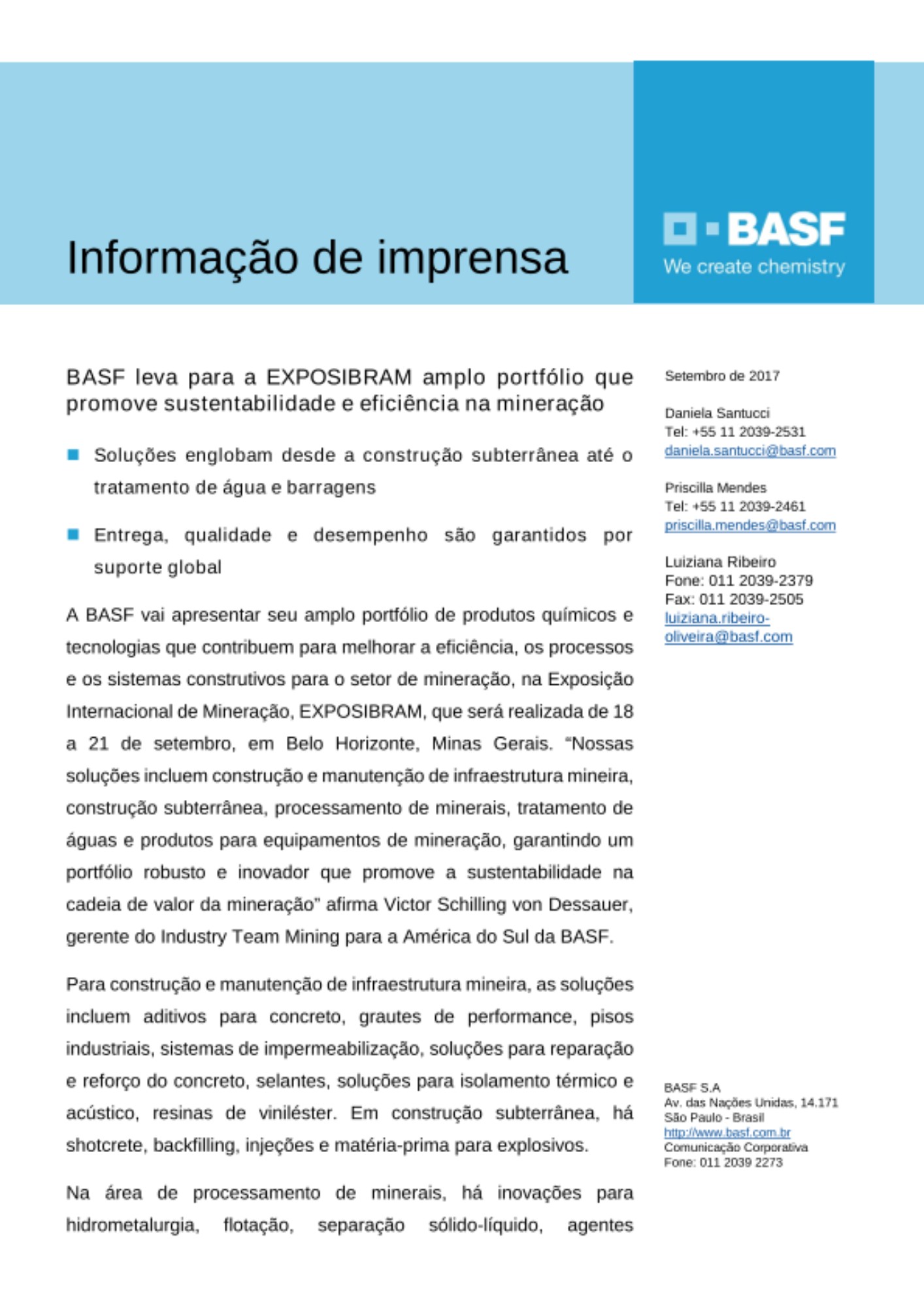 A BASF vai apresentar seu amplo portfólio de produtos químicos e tecnologias que contribuem para melhorar a eficiência, os processos e os sistemas construtivos para o setor de mineração, na Exposição Internacional de Mineração, EXPOSIBRAM, que será realizada de 18 a 21 de setembro, em Belo Horizonte, Minas Gerais. “Nossas soluções incluem construção e manutenção de infraestrutura mineira, construção subterrânea, processamento de minerais, tratamento de águas e produtos para equipamentos de mineração, garantindo um portfólio robusto e inovador que promove a sustentabilidade na cadeia de valor da mineração” afirma Victor Schilling von Dessauer, gerente do Industry Team Mining para a América do Sul da BASF.