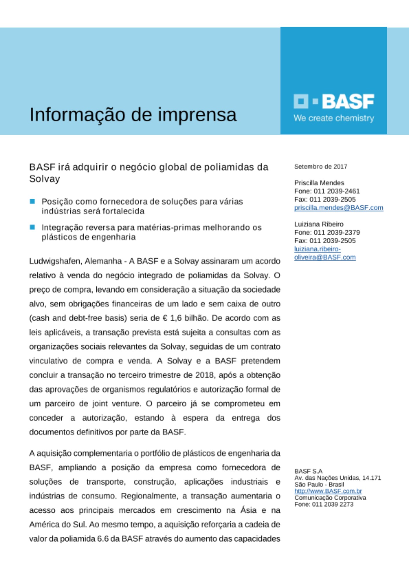 Ludwigshafen, Alemanha - A BASF e a Solvay assinaram um acordo relativo à venda do negócio integrado de poliamidas da Solvay. O preço de compra, levando em consideração a situação da sociedade alvo, sem obrigações financeiras de um lado e sem caixa de outro (cash and debt-free basis) seria de € 1,6 bilhão. De acordo com as leis aplicáveis, a transação prevista está sujeita a consultas com as organizações sociais relevantes da Solvay, seguidas de um contrato vinculativo de compra e venda. A Solvay e a BASF pretendem concluir a transação no terceiro trimestre de 2018, após a obtenção das aprovações de organismos regulatórios e autorização formal de um parceiro de joint venture. O parceiro já se comprometeu em conceder a autorização, estando à espera da entrega dos documentos definitivos por parte da BASF.