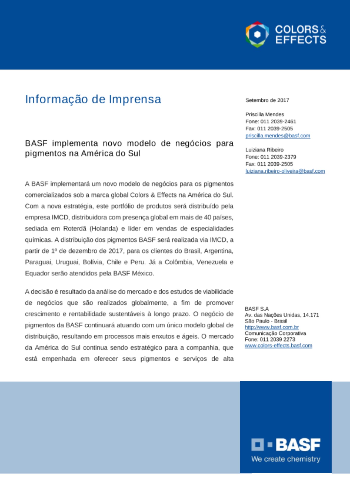A BASF implementará um novo modelo de negócios para os pigmentos comercializados sob a marca global Colors & Effects na América do Sul. Com a nova estratégia, este portfólio de produtos será distribuído pela empresa IMCD, distribuidora com presença global em mais de 40 países, sediada em Roterdã (Holanda) e líder em vendas de especialidades químicas. A distribuição dos pigmentos BASF será realizada via IMCD, a partir de 1º de dezembro de 2017, para os clientes do Brasil, Argentina, Paraguai, Uruguai, Bolívia, Chile e Peru. Já a Colômbia, Venezuela e Equador serão atendidos pela BASF México.