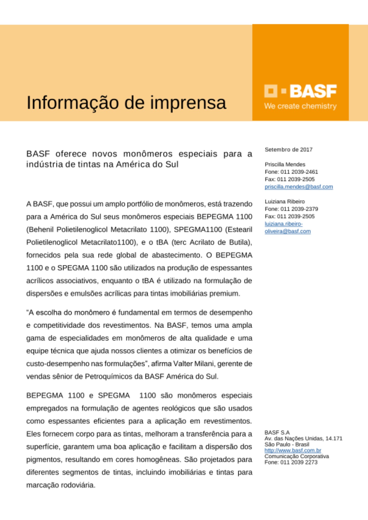 A BASF, que possui um amplo portfólio de monômeros, está trazendo para a América do Sul seus monômeros especiais BEPEGMA 1100 (Behenil Polietilenoglicol Metacrilato 1100), SPEGMA1100 (Estearil Polietilenoglicol Metacrilato1100), e o tBA (terc Acrilato de Butila), fornecidos pela sua rede global de abastecimento. O BEPEGMA 1100 e o SPEGMA 1100 são utilizados na produção de espessantes acrílicos associativos, enquanto o tBA é utilizado na formulação de dispersões e emulsões acrílicas para tintas imobiliárias premium.