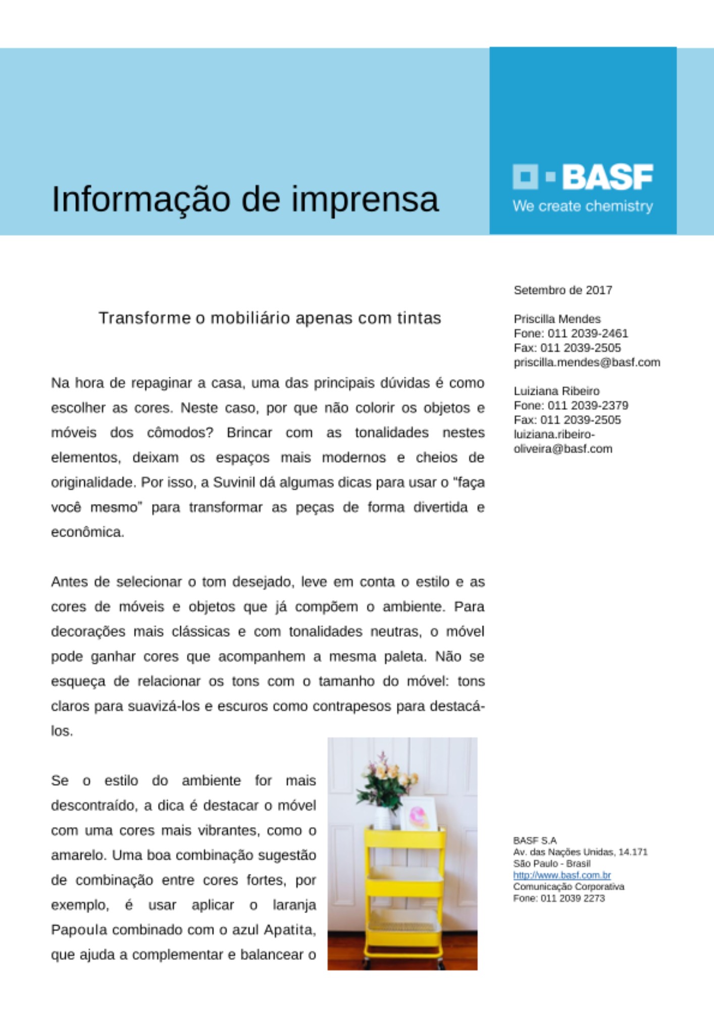 Na BASF, nós transformamos a química para um futuro sustentável. Nós combinamos o sucesso econômico com a proteção ambiental e responsabilidade social. O Grupo BASF conta com aproximadamente 114 mil colaboradores que trabalham para contribuir com o sucesso de nossos clientes em quase todos os setores e países do mundo. Nosso portfólio é organizado em 5 segmentos: Químicos, Produtos de Performance, Materiais e Soluções Funcionais, Soluções para Agricultura e Petróleo e Gás. A BASF gerou vendas de mais de € 58 bilhões em 2016. As ações da BASF são comercializadas no mercado de ações de Frankfurt (BAS), Londres (BFA) e Zurich (AN). Para mais informações, acesse: www.basf.com.br.