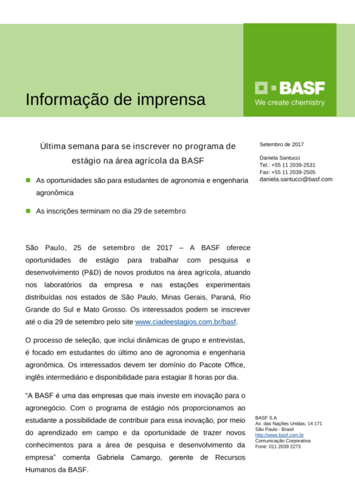 São Paulo, 25 de setembro de 2017 – A BASF oferece oportunidades de estágio para trabalhar com pesquisa e desenvolvimento (P&D) de novos produtos na área agrícola, atuando nos laboratórios da empresa e nas estações experimentais distribuídas nos estados de São Paulo, Minas Gerais, Paraná, Rio Grande do Sul e Mato Grosso. Os interessados podem se inscrever até o dia 29 de setembro pelo site www.ciadeestagios.com.br/basf.