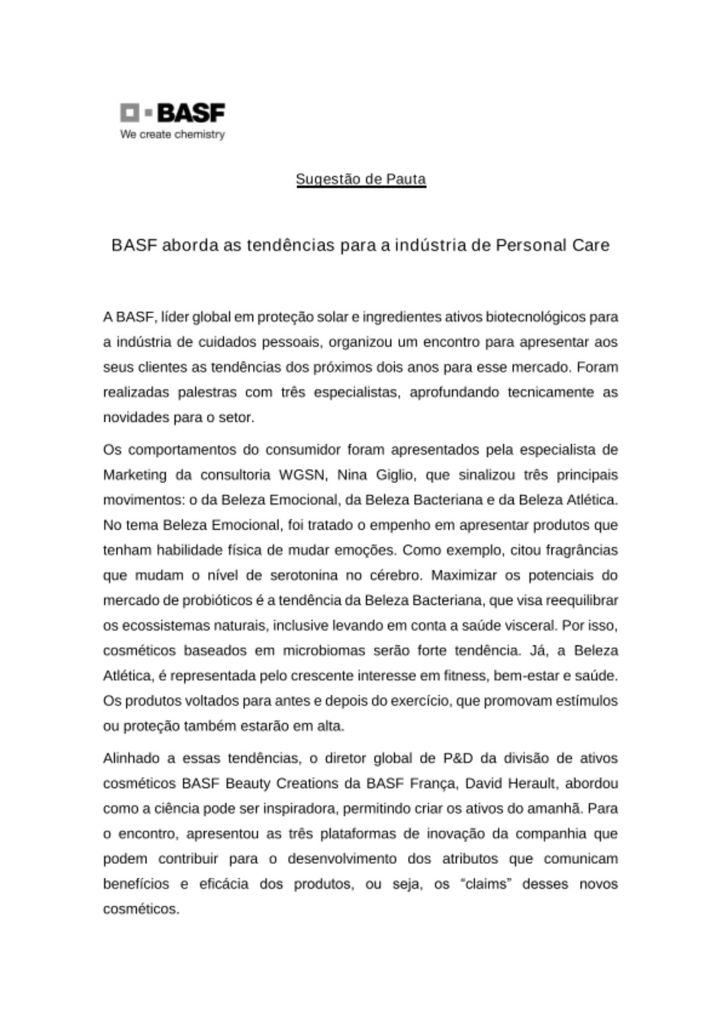 A BASF, líder global em proteção solar e ingredientes ativos biotecnológicos para a indústria de cuidados pessoais, organizou um encontro para apresentar aos seus clientes as tendências dos próximos dois anos para esse mercado. Foram realizadas palestras com três especialistas, aprofundando tecnicamente as novidades para o setor.