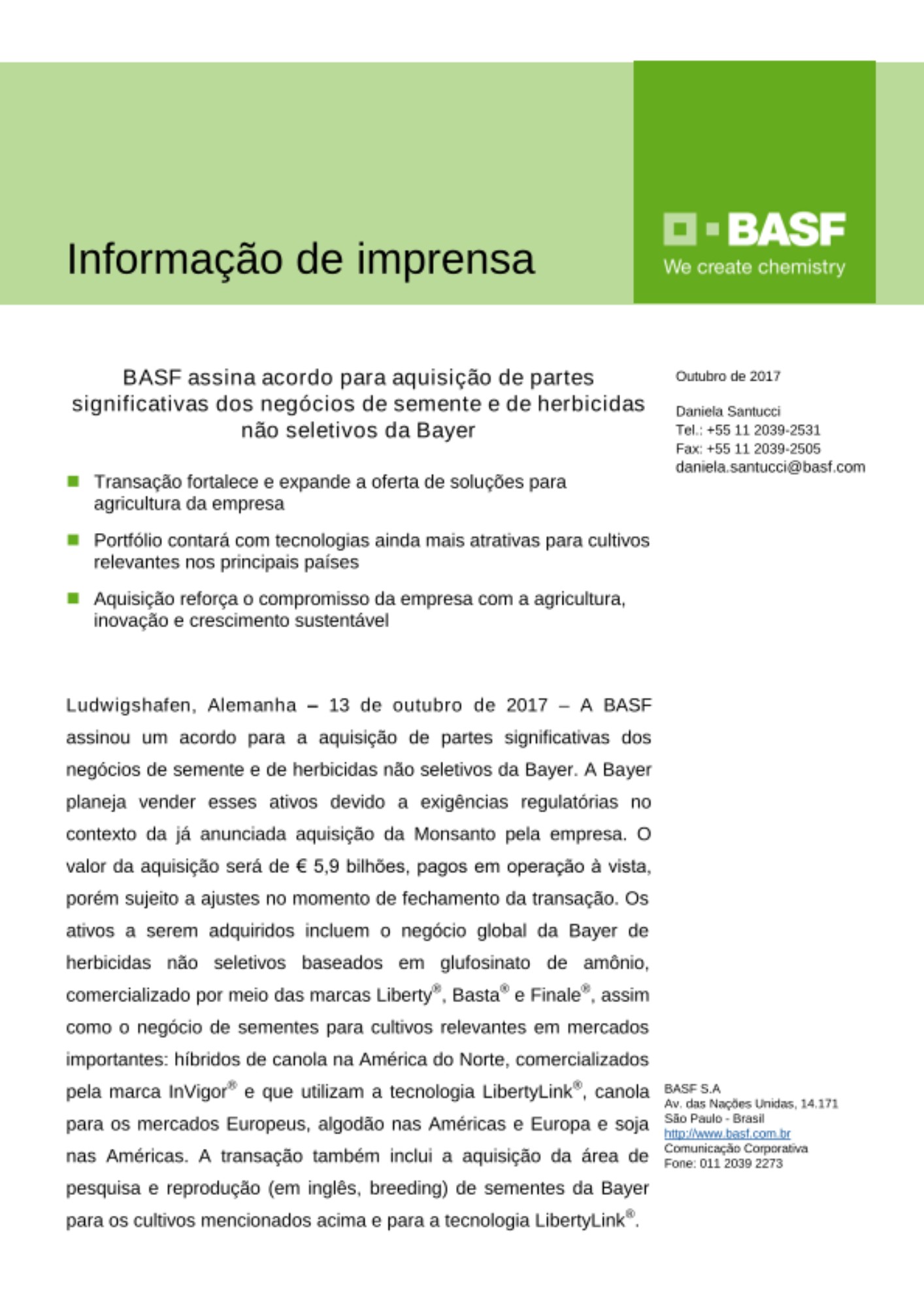 A BASF assinou um acordo para a aquisição de partes significativas dos negócios de semente e de herbicidas não seletivos da Bayer. A Bayer planeja vender esses ativos devido a exigências regulatórias no contexto da já anunciada aquisição da Monsanto pela empresa. O valor da aquisição será de € 5,9 bilhões, pagos em operação à vista, porém sujeito a ajustes no momento de fechamento da transação. Os ativos a serem adquiridos incluem o negócio global da Bayer de herbicidas não seletivos baseados em glufosinato de amônio, comercializado por meio das marcas Liberty®, Basta® e Finale®, assim como o negócio de sementes para cultivos relevantes em mercados importantes: híbridos de canola na América do Norte, comercializados pela marca InVigor® e que utilizam a tecnologia LibertyLink®, canola para os mercados Europeus, algodão nas Américas e Europa e soja nas Américas. A transação também inclui a aquisição da área de pesquisa e reprodução (em inglês, breeding) de sementes da Bayer para os cultivos mencionados acima e para a tecnologia LibertyLink®. No ano de 2016, as vendas dos negócios que serão adquiridos pela BASF geraram vendas na casa de € 1,3 bilhão para a Bayer e um lucro antes de juros, impostos, depreciação e amortização (Ebitda, na sigla em inglês) de cerca de € 385 milhões. A aquisição está sujeita ao recebimento das aprovações regulatórias necessárias e seu fechamento deve ocorrer no primeiro trimestre de 2018.