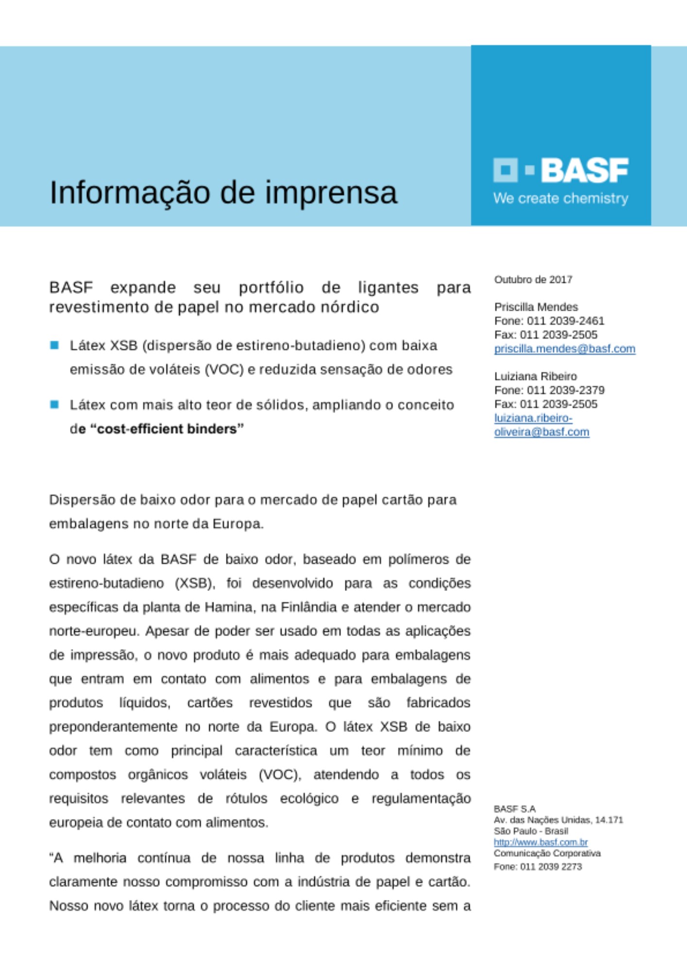 O novo látex da BASF de baixo odor, baseado em polímeros de estireno-butadieno (XSB), foi desenvolvido para as condições específicas da planta de Hamina, na Finlândia e atender o mercado norte-europeu. Apesar de poder ser usado em todas as aplicações de impressão, o novo produto é mais adequado para embalagens que entram em contato com alimentos e para embalagens de produtos líquidos, cartões revestidos que são fabricados preponderantemente no norte da Europa. O látex XSB de baixo odor tem como principal característica um teor mínimo de compostos orgânicos voláteis (VOC), atendendo a todos os requisitos relevantes de rótulos ecológico e regulamentação europeia de contato com alimentos.