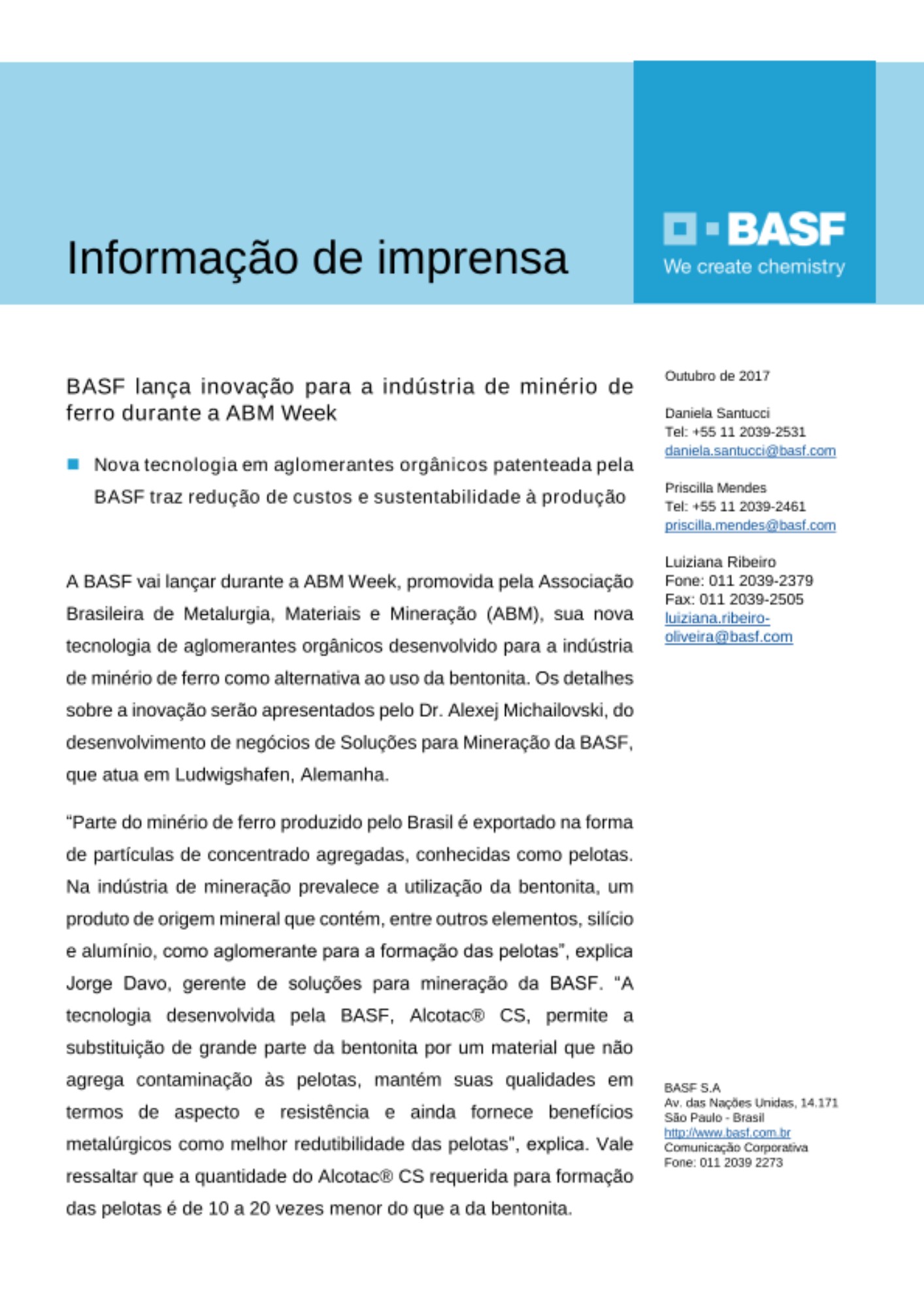 A BASF vai lançar durante a ABM Week, promovida pela Associação Brasileira de Metalurgia, Materiais e Mineração (ABM), sua nova tecnologia de aglomerantes orgânicos desenvolvido para a indústria de minério de ferro como alternativa ao uso da bentonita. Os detalhes sobre a inovação serão apresentados pelo Dr. Alexej Michailovski, do desenvolvimento de negócios de Soluções para Mineração da BASF, que atua em Ludwigshafen, Alemanha.