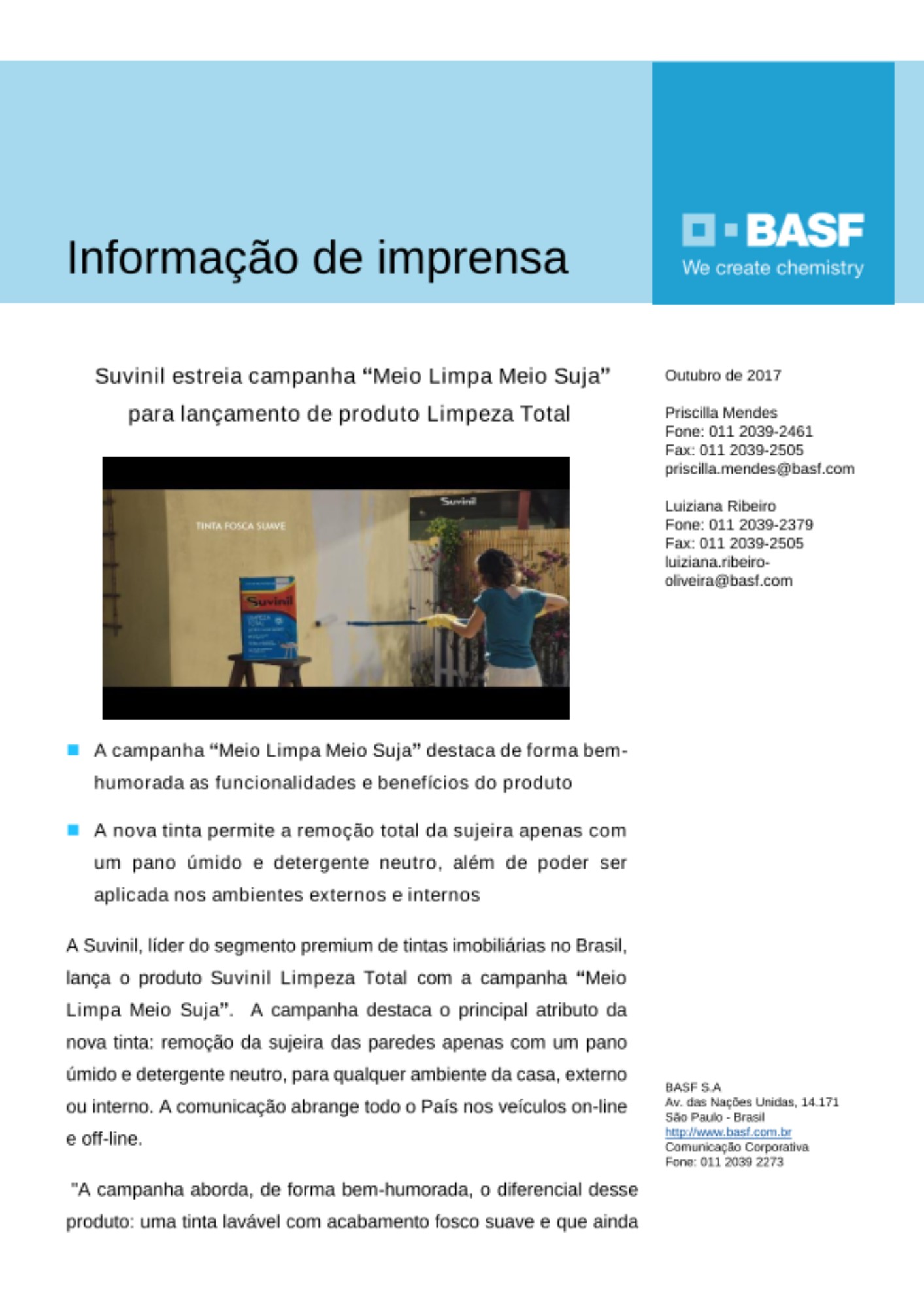 A Suvinil, líder do segmento premium de tintas imobiliárias no Brasil, lança o produto Suvinil Limpeza Total com a campanha “Meio Limpa Meio Suja”. A campanha destaca o principal atributo da nova tinta: remoção da sujeira das paredes apenas com um pano úmido e detergente neutro, para qualquer ambiente da casa, externo ou interno. A comunicação abrange todo o País nos veículos on-line e off-line.