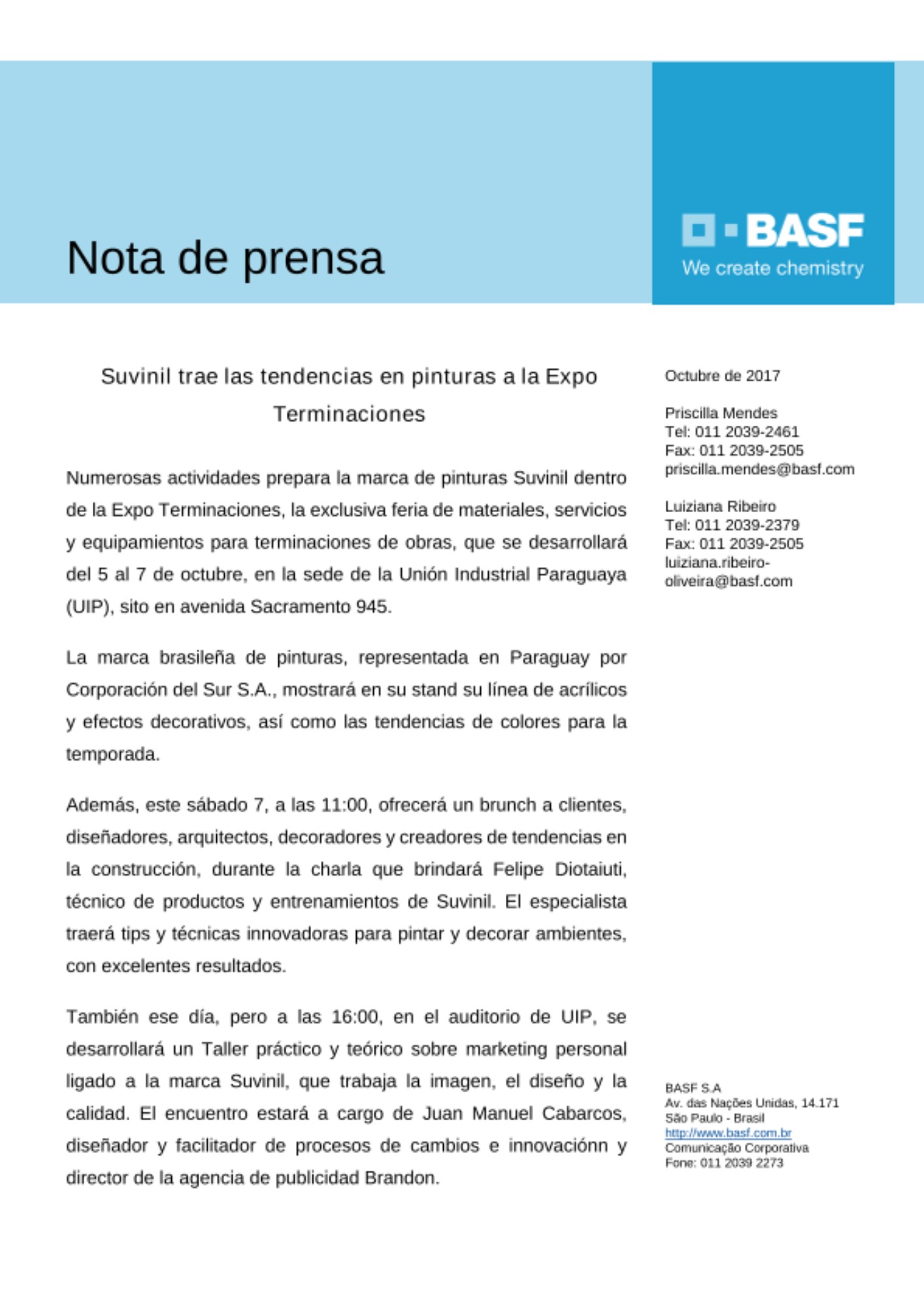 Suvinil es la marca de tintas inmobiliarias premium de BASF y líder en su sector. La marca tiene una estrategia de negocio consistente, enfocada en su relación con clientes, innovación e grandes inversiones. Adquirida en 1969 por BASF, que entraba en el segmento de tintas en nivel mundial, Suvinil tiene más de 50 años de buenas prácticas, que resultan en una completa línea de productos hechos por látex PVA, acrílicos, esmaltes, barnices, epoxi y complementos para la pintura. Su portfolio es producido en las fábricas ubicadas en São Bernardo do Campo (SP) y Jaboatão dos Guararapes (PE), ambas en Brasil y además atender todo el mercado nacional, atiende las demandas de Paraguay.