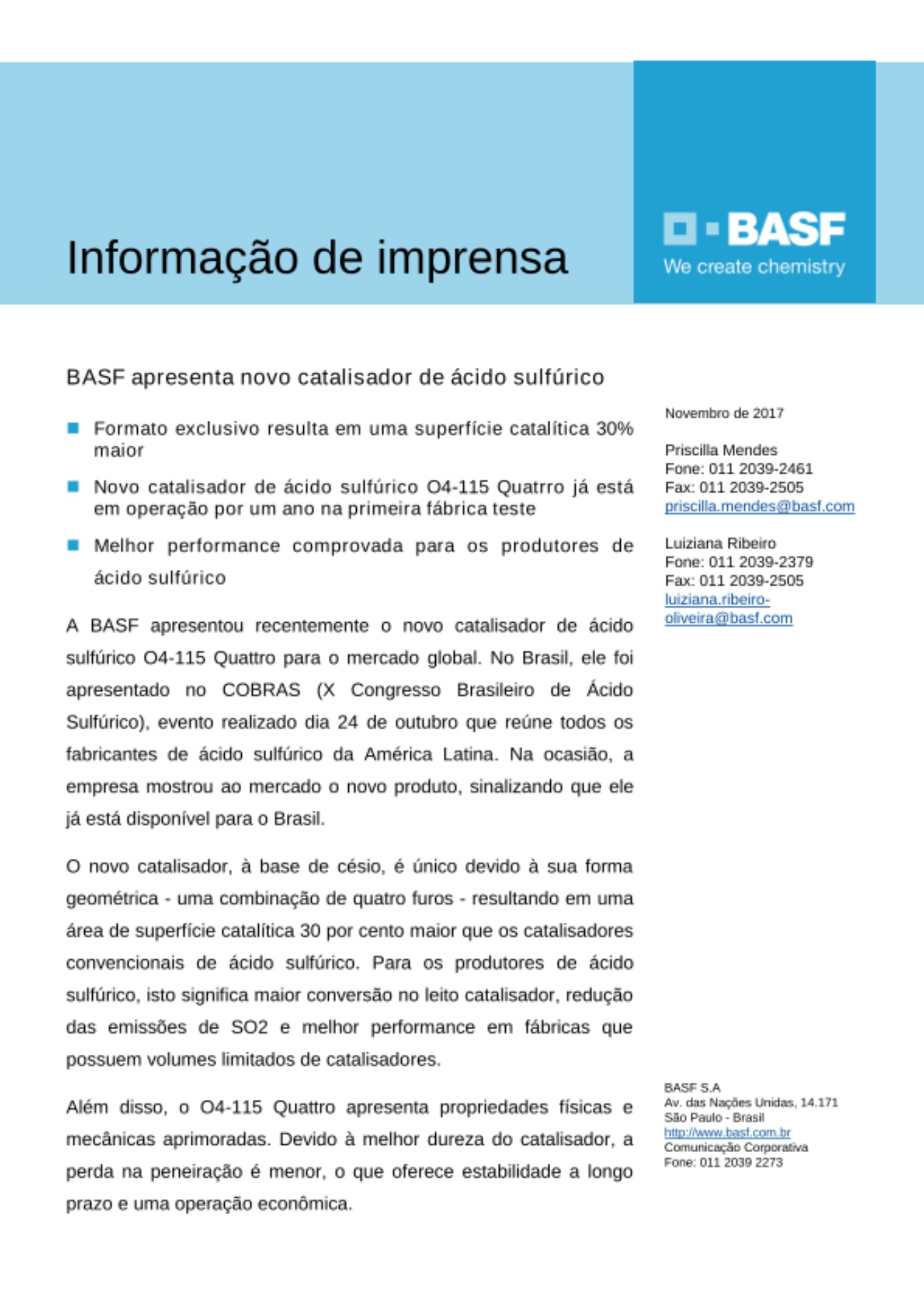 A BASF apresentou recentemente o novo catalisador de ácido sulfúrico O4-115 Quattro para o mercado global. No Brasil, ele foi apresentado no COBRAS (X Congresso Brasileiro de Ácido Sulfúrico), evento realizado dia 24 de outubro que reúne todos os fabricantes de ácido sulfúrico da América Latina. Na ocasião, a empresa mostrou ao mercado o novo produto, sinalizando que ele já está disponível para o Brasil.