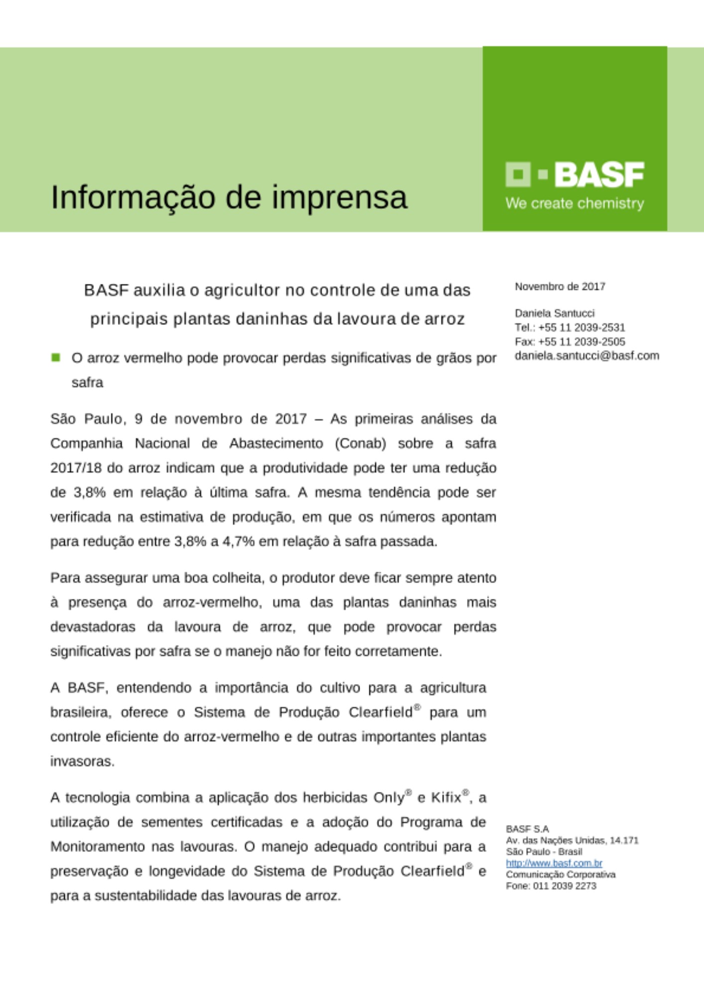 “O Sistema de Produção Clearfield®, permite ao produtor otimizar seus recursos e melhorar a qualidade e produtividade das lavouras. Se não tivéssemos desenvolvido essa tecnologia, certamente grandes áreas de cultivo de arroz estariam inviabilizadas devido a ocorrência do arroz vermelho”, destaca Helio de Souza Cabral, gerente de Marketing Arroz da BASF.