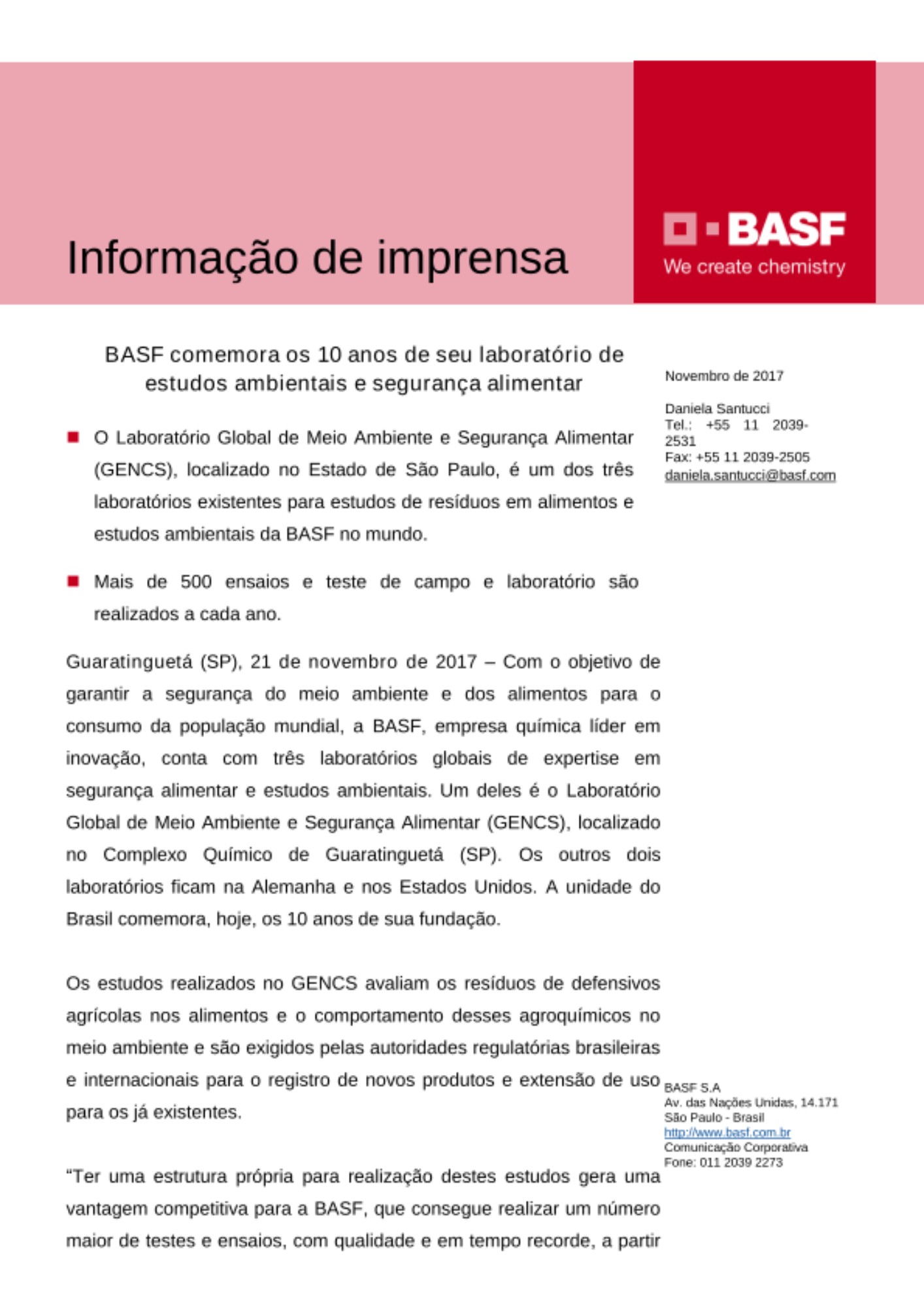Com o objetivo de garantir a segurança do meio ambiente e dos alimentos para o consumo da população mundial, a BASF, empresa química líder em inovação, conta com três laboratórios globais de expertise em segurança alimentar e estudos ambientais. Um deles é o Laboratório Global de Meio Ambiente e Segurança Alimentar (GENCS), localizado no Complexo Químico de Guaratinguetá (SP). Os outros dois laboratórios ficam na Alemanha e nos Estados Unidos. A unidade do Brasil comemora, hoje, os 10 anos de sua fundação.