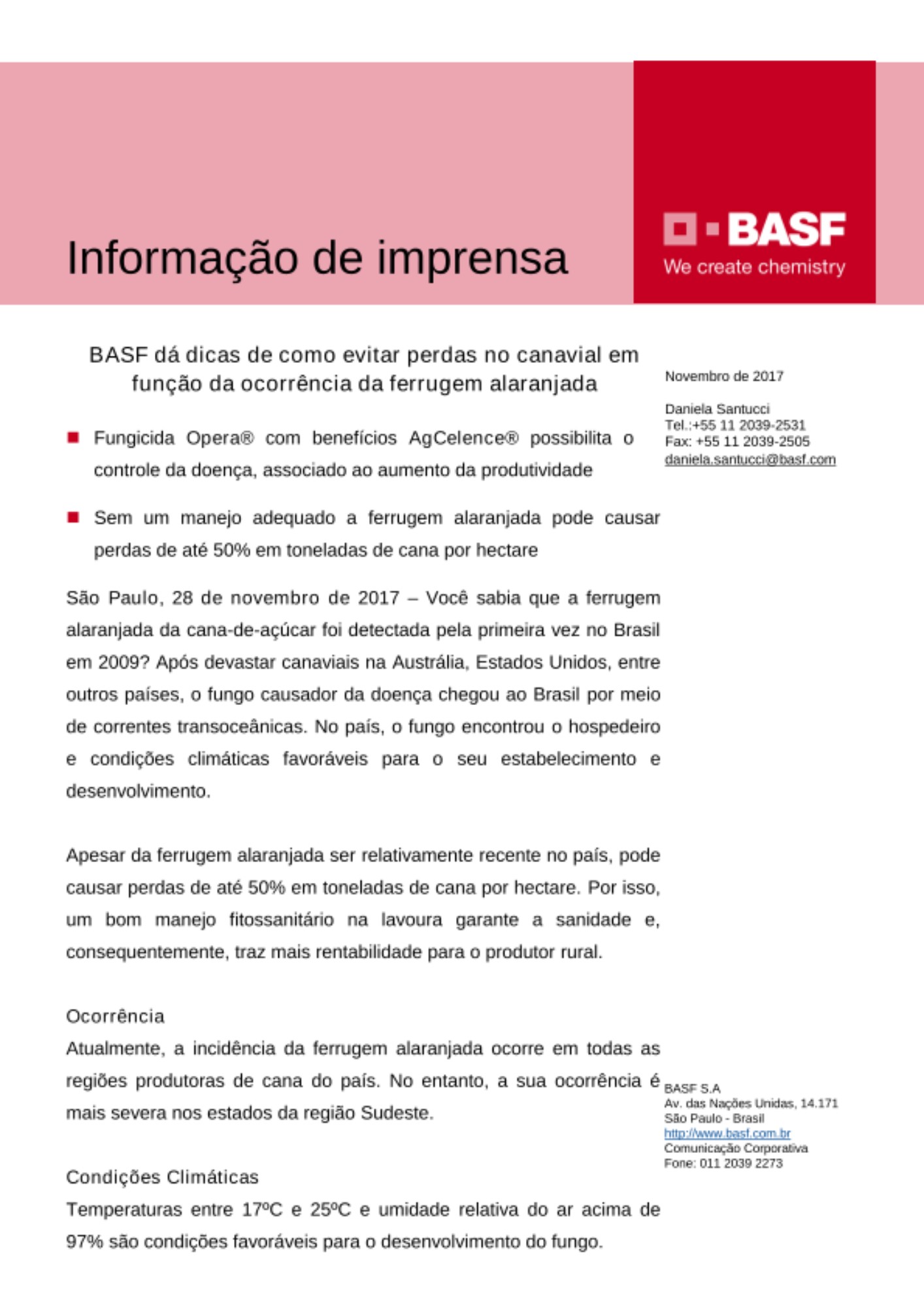 Com uma população em rápido crescimento, o mundo está cada vez mais dependente da nossa capacidade de desenvolver e manter uma agricultura sustentável e ambientes saudáveis. A divisão de Proteção de Cultivos da BASF trabalha com agricultores, profissionais agrícolas e especialistas em manejo de pragas para ajudar a tornar isso possível. Com a cooperação desses parceiros, a BASF é capaz de sustentar um robusto pipeline de P&D, um portfólio inovador de produtos e serviços e equipes de peritos no laboratório e em campo para apoiar nossos clientes no sucesso dos seus negócios. Em 2016, a divisão de Proteção de Cultivos da BASF gerou vendas de mais de € 5,6 bilhões. Para obter mais informações, visite-nos em www.agro.basf.com ou por meio de nossos canais de mídias sociais.