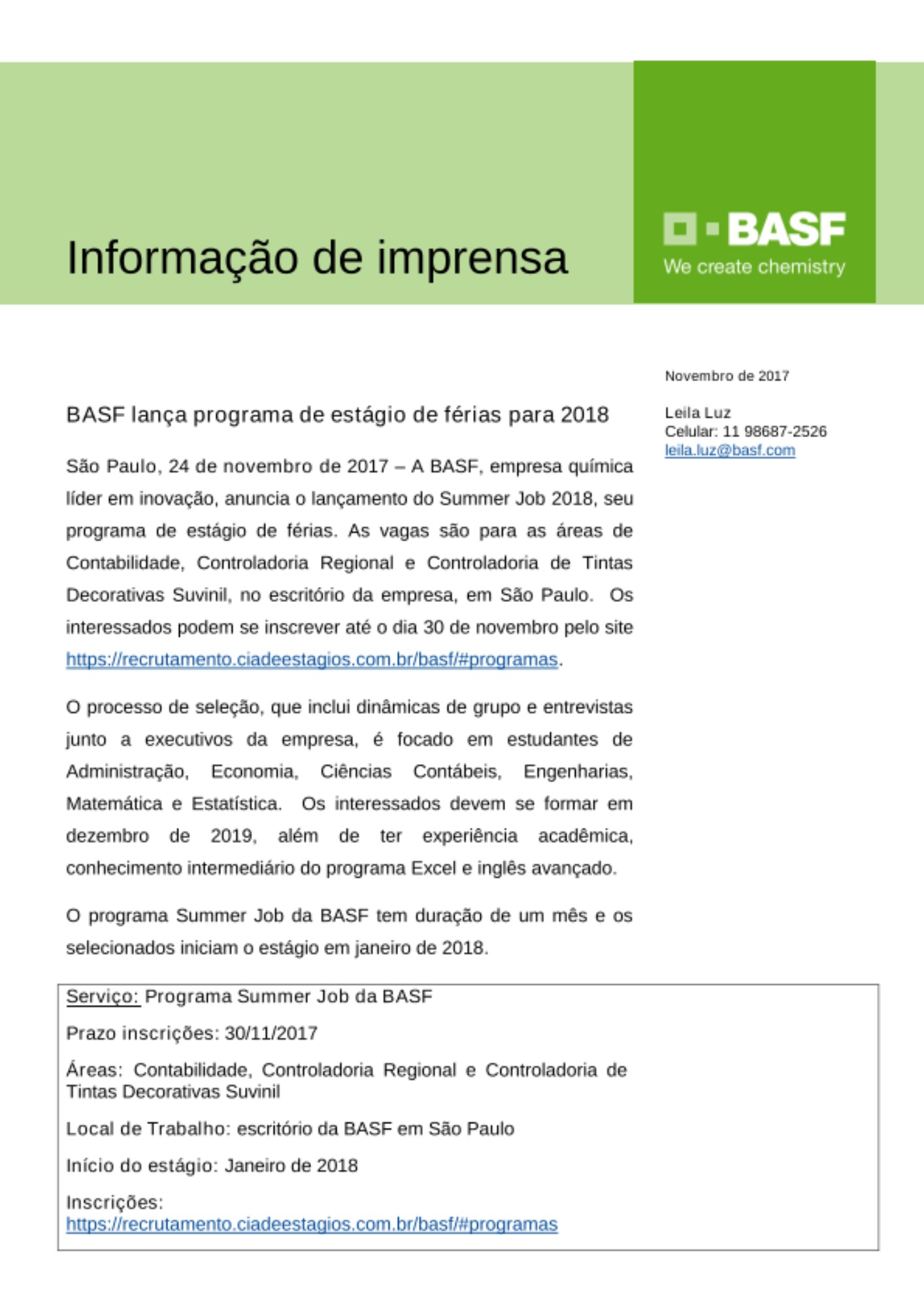 A BASF, empresa química líder em inovação, anuncia o lançamento do Summer Job 2018, seu programa de estágio de férias. As vagas são para as áreas de Contabilidade, Controladoria Regional e Controladoria de Tintas Decorativas Suvinil, no escritório da empresa, em São Paulo. Os interessados podem se inscrever até o dia 30 de novembro pelo site https://recrutamento.ciadeestagios.com.br/basf/#programas.