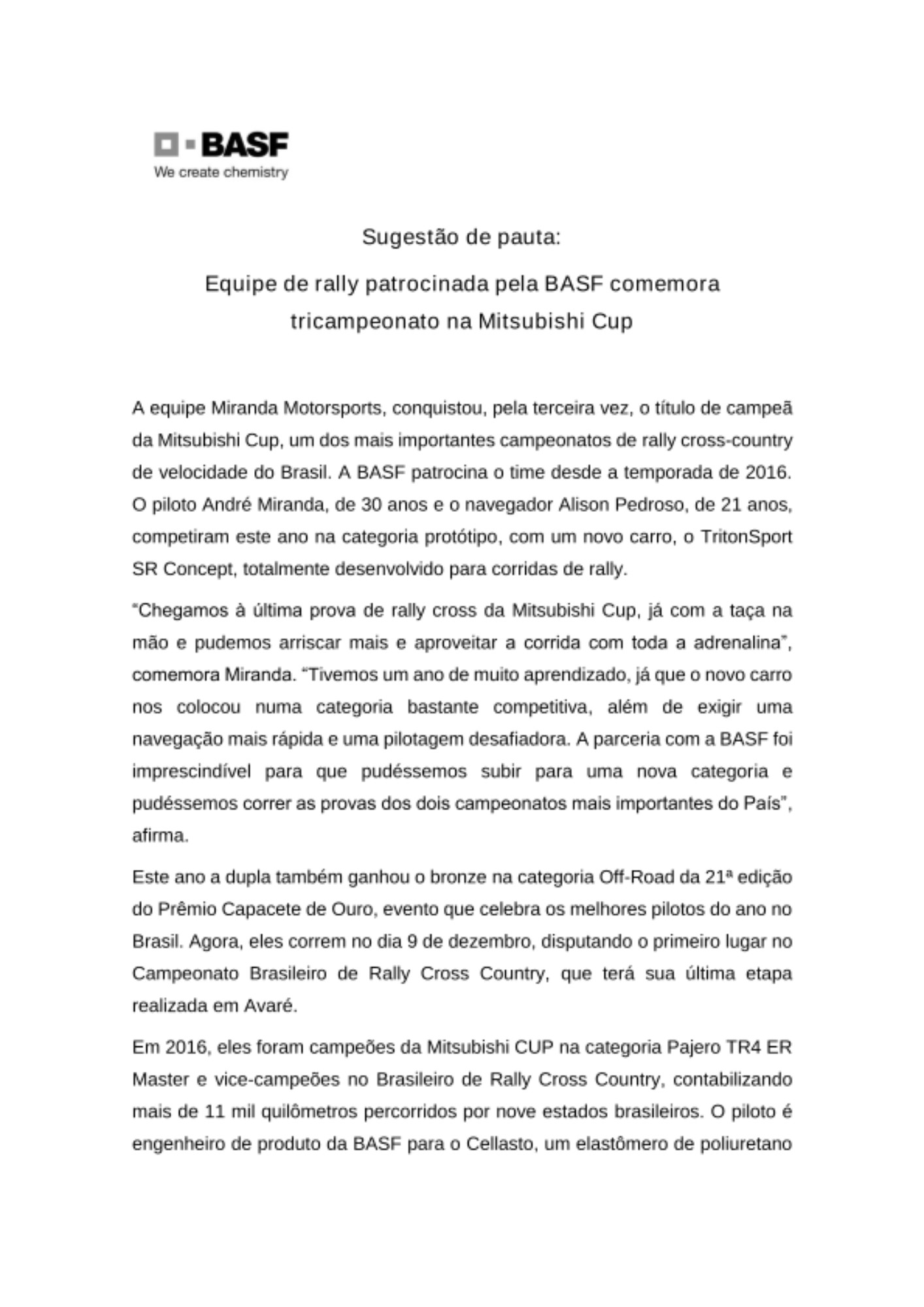 A equipe Miranda Motorsports, conquistou, pela terceira vez, o título de campeã da Mitsubishi Cup, um dos mais importantes campeonatos de rally cross-country de velocidade do Brasil. A BASF patrocina o time desde a temporada de 2016. O piloto André Miranda, de 30 anos e o navegador Alison Pedroso, de 21 anos, competiram este ano na categoria protótipo, com um novo carro, o TritonSport SR Concept, totalmente desenvolvido para corridas de rally.