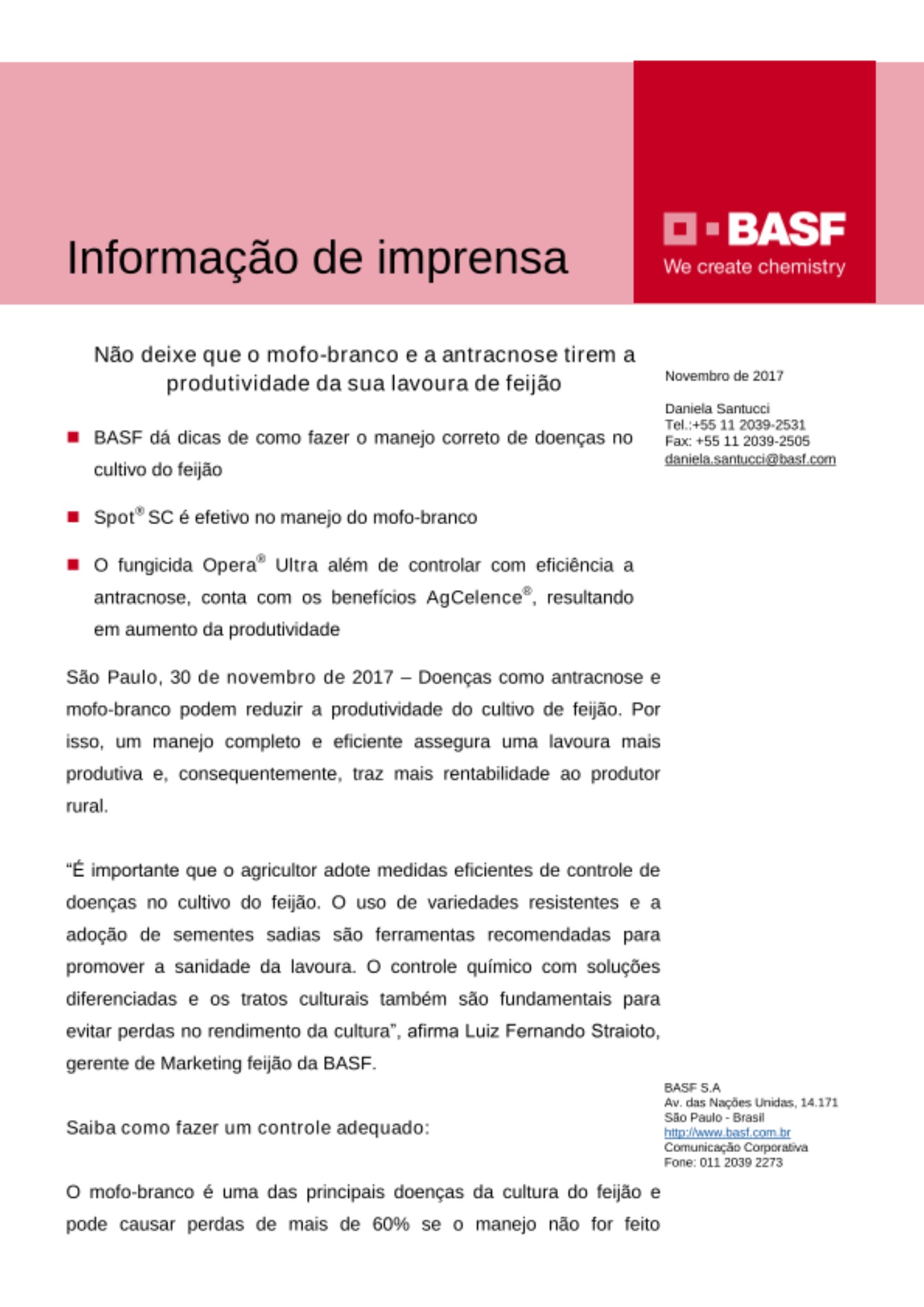 A BASF, atenta às necessidades do produtor rural, oferece o fungicida Spot® SC que controla efetivamente o mofo-branco na cultura do feijão. A solução da BASF combina dois mecanismos distintos de ação com os ativos Boscalida e Dimoxistrobina, que juntos proporcionam a manutenção do potencial produtivo devido à redução das estruturas de resistência conhecidas como escleródios. De acordo com pesquisas, se o controle não for feito de forma adequada, os escleródios podem sobreviver por um período de até 11 anos.