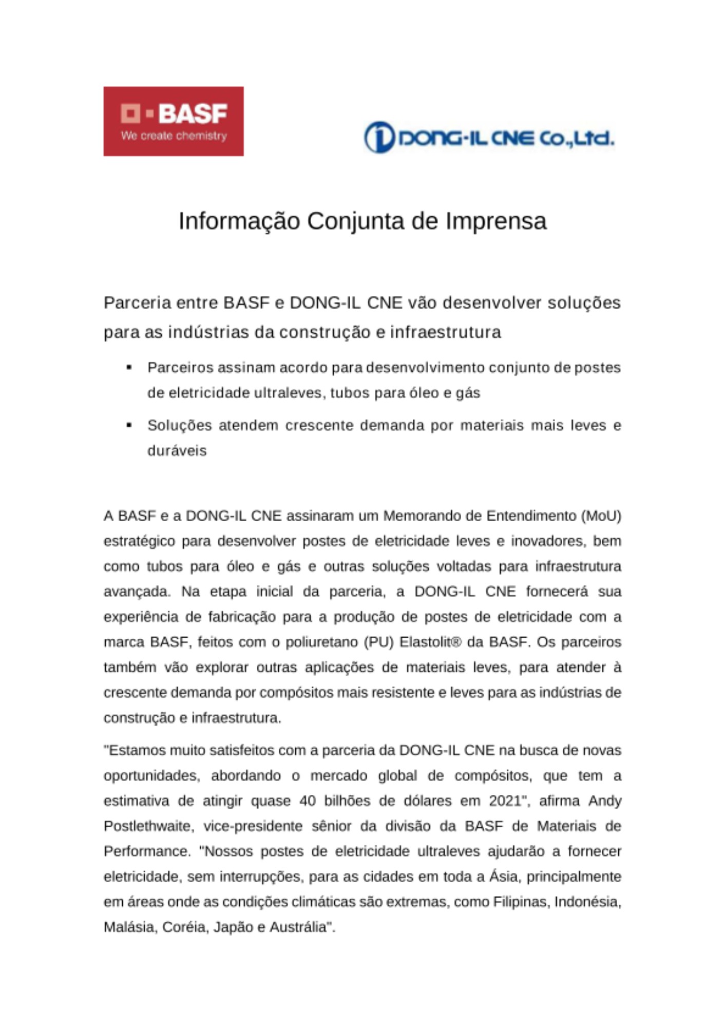 A BASF e a DONG-IL CNE assinaram um Memorando de Entendimento (MoU) estratégico para desenvolver postes de eletricidade leves e inovadores, bem como tubos para óleo e gás e outras soluções voltadas para infraestrutura avançada. Na etapa inicial da parceria, a DONG-IL CNE fornecerá sua experiência de fabricação para a produção de postes de eletricidade com a marca BASF, feitos com o poliuretano (PU) Elastolit® da BASF. Os parceiros também vão explorar outras aplicações de materiais leves, para atender à crescente demanda por compósitos mais resistente e leves para as indústrias de construção e infraestrutura.