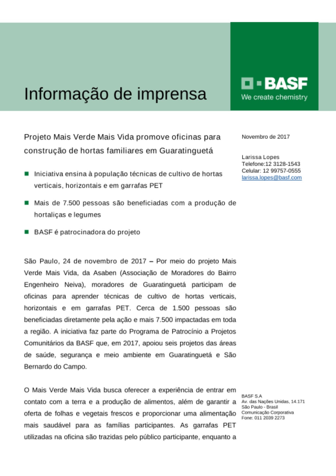 Por meio do projeto Mais Verde Mais Vida, da Asaben (Associação de Moradores do Bairro Engenheiro Neiva), moradores de Guaratinguetá participam de oficinas para aprender técnicas de cultivo de hortas verticais, horizontais e em garrafas PET. Cerca de 1.500 pessoas são beneficiadas diretamente pela ação e mais 7.500 impactadas em toda a região. A iniciativa faz parte do Programa de Patrocínio a Projetos Comunitários da BASF que, em 2017, apoiou seis projetos das áreas de saúde, segurança e meio ambiente em Guaratinguetá e São Bernardo do Campo.