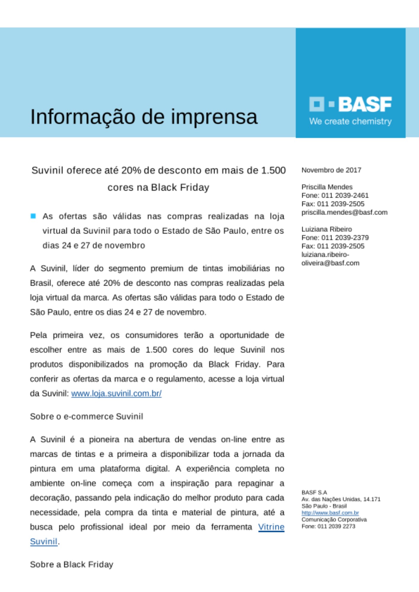 Pela primeira vez, os consumidores terão a oportunidade de escolher entre as mais de 1.500 cores do leque Suvinil nos produtos disponibilizados na promoção da Black Friday. Para conferir as ofertas da marca e o regulamento, acesse a loja virtual da Suvinil: www.loja.suvinil.com.br/