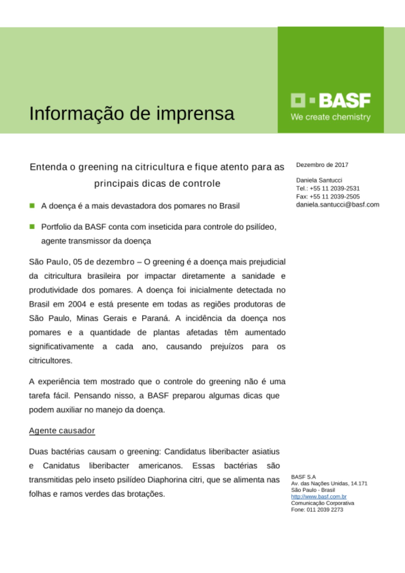 Com uma população em rápido crescimento, o mundo está cada vez mais dependente da nossa capacidade de desenvolver e manter uma agricultura sustentável e ambientes saudáveis. A divisão de Proteção de Cultivos da BASF trabalha com agricultores, profissionais agrícolas e especialistas em manejo de pragas para ajudar a tornar isso possível. Com a cooperação desses parceiros, a BASF é capaz de sustentar um robusto pipeline de P&D, um portfólio inovador de produtos e serviços e equipes de peritos no laboratório e em campo para apoiar nossos clientes no sucesso dos seus negócios. Em 2016, a divisão de Proteção de Cultivos da BASF gerou vendas de mais de € 5,6 bilhões. Para obter mais informações, visite-nos em www.agro.basf.com ou por meio de nossos canais de mídias sociais. Sobre a BASF Na BASF, nós transformamos a química para um futuro sustentável. Nós combinamos o sucesso econômico com a proteção ambiental e responsabilidade social. O Grupo BASF conta com aproximadamente 114 mil colaboradores que trabalham para contribuir com o sucesso de nossos clientes em quase todos os setores e países do mundo. Nosso portfólio é organizado em 5 segmentos: Químicos, Produtos de Performance, Materiais e Soluções Funcionais, Soluções para Agricultura e Petróleo e Gás. A BASF gerou vendas de mais de € 58 bilhões em 2016. As ações da BASF são comercializadas no mercado de ações de Frankfurt (BAS), Londres (BFA) e Zurich (AN). Para mais informações, acesse: www.basf.com.br.